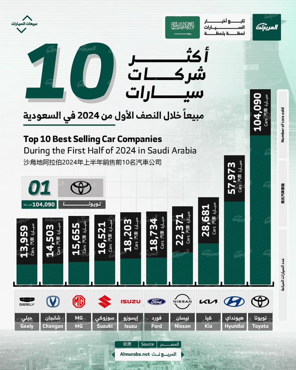 في صدارة القائمة جاءت شركة السيارات اليابانية تويوتا والتي سجلت معدل مبيعات خلال النصف الأول من عام 2024 بلغ 104,090 سيارة، يليها في المركز الثاني شركة السيارات الكورية الجنوبية هيونداي بمعدل مبيعات بلغ 57,973 سيارة.