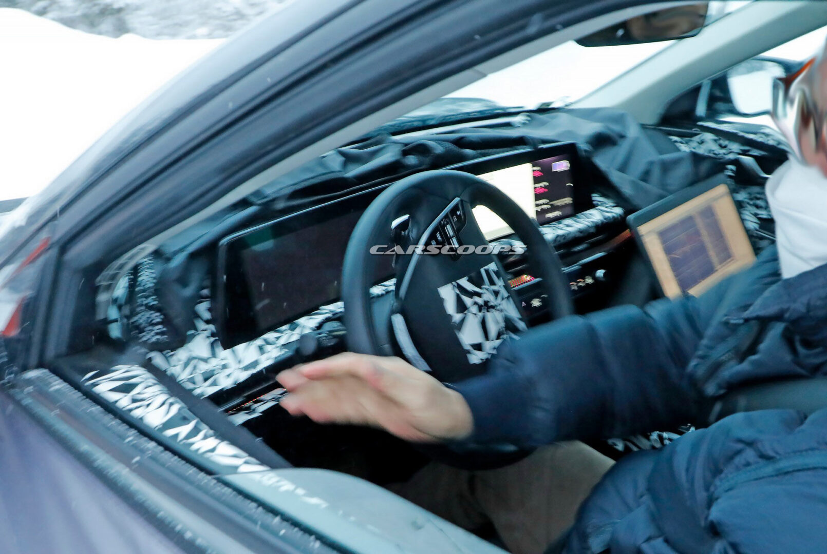 وقد ظهرت داخلية كيا CV القادمة لأول مرة في صور تجسسية أثناء الاختبارات الثلجية في السويد بجوار هيونداي أيونيك 5، ويمكن ملاحظة بعض ملامح التصميم الداخلي والشاشات الرقمية ونظام الإضاءة المحيطية للسيارة.