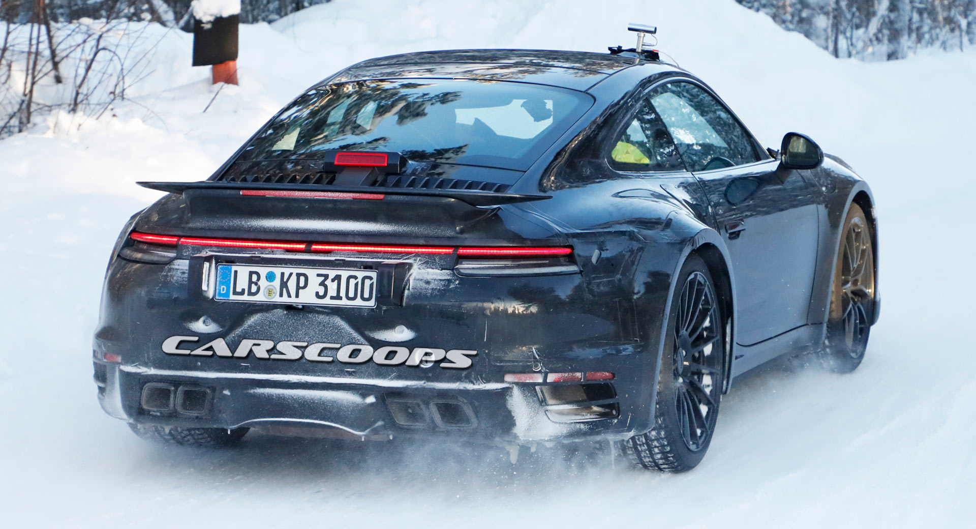 يبدو لنا أن 992 تيربو هذه لديها جسد إنتاجي، ما يعطينا نظرة واضحة على ما تنوي بورش أن تفعله في تصميمها، وأكثر ما يمكننا ملاحظته هو الرفارف العريضة والجناح الخلفي والعوادم الخلخفية الرباعية المستطيلة وكذلك المصابيح الخلفية المستوحاة من Mission E الكهربائية.