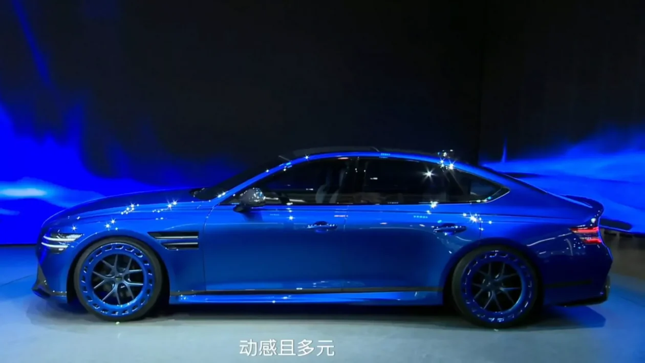 والآن كشفت جينيسيس عن النسخة الكهربائية بالكامل للسيدان الرياضية في معرض بكين للدولي للسيارات، بطلاء أزرق هادئ نسبياً مقارنة بالطلاء البرتقالي الصاخب لنسخة 6 سلندر، مع عجلات 21 إنش عجلات، واستخدام مكثف لألياف الكربون في الخارجية.