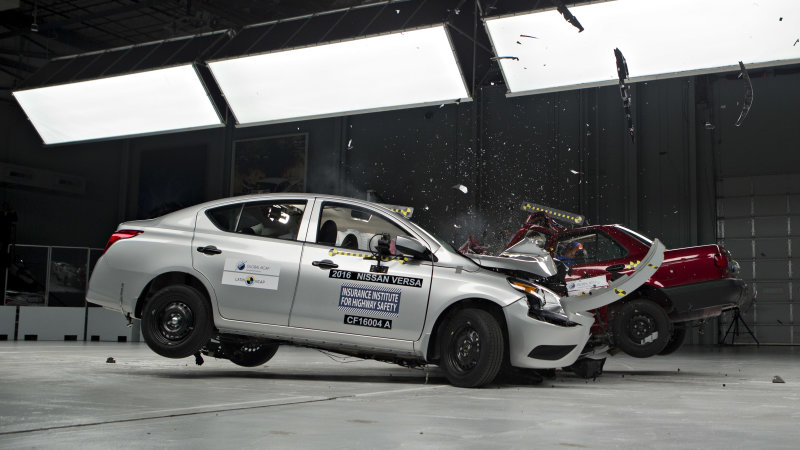 تعتبر اختبارات معهد التأمين والسلامة أصعب وذلك ﻷنها تعتمد على اختبارات تصادم متوازنة، فعند الاصطدام بحائط مربع، تتوزع القوة على مقدمة السيارة بالكامل وهو ما يؤدي لتحطمها من أجل امتصاص الصدمة، ولذا يعمل المعهد على عقد اختباراته خارج المعمل مع استخدام أجسام لا تلامس مقدمة السيارة بالكامل، ما يعني انخفاض قدرة المقدمة على امتصاص الصدمة بنسبة 25% إلى 40%.