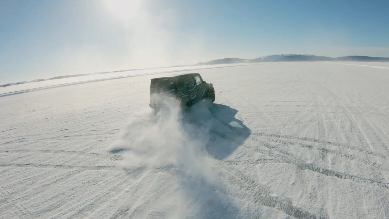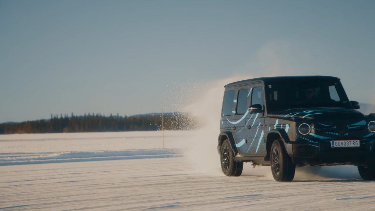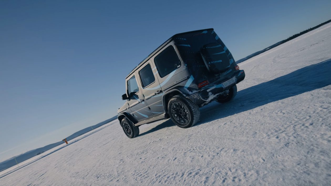 في نهاية الفيديو بعد العديد من التجارب التي أثبتت مدى ثبات مرسيدس جي كلاس الكهربائية على الطرق الثلجية، قام كالينيوس باستعراض قدرات السيارة على الدريفت أثناء القيادة على البحيرة المجمدة بعد غلق أنظمة الأمن والسلامة التي تساعد على ثبات سيارة الدفع الرباعي الفاخرة.