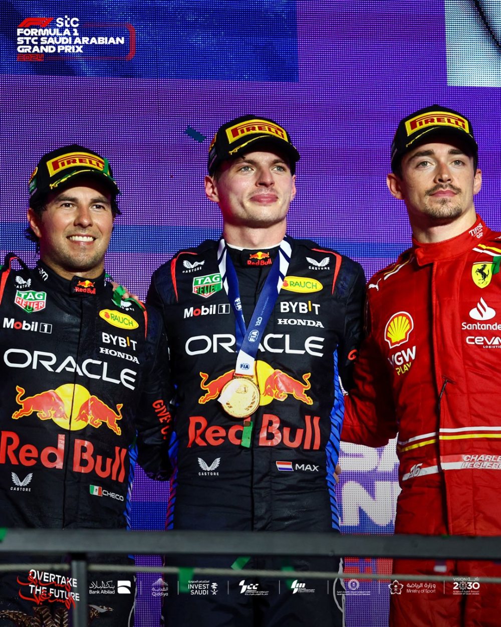 فاز ماكس فرستابن بالمركز الأول مع الوضع بالاعتبار أن صاحب المركز الثاني أيضاً من نفس الفريق ” رد بول”، وهو المكسيكي سيرجيو بيريز والذي نجح في تحقيق المركز الأول لمسابقة جائزة السعودية الكبرى للفورمولا 1 لعام 2023، وجاء بالمركز الثاني سيرجيو بيريز بفارق زمني خلف ماكس فرستابن بمُدة 13.643 ثانية، أما صاحب المركز الثالث هنا الحديث حول شركة فيراري حيث حصد السائق شارل لوكلير المركز الثالث.