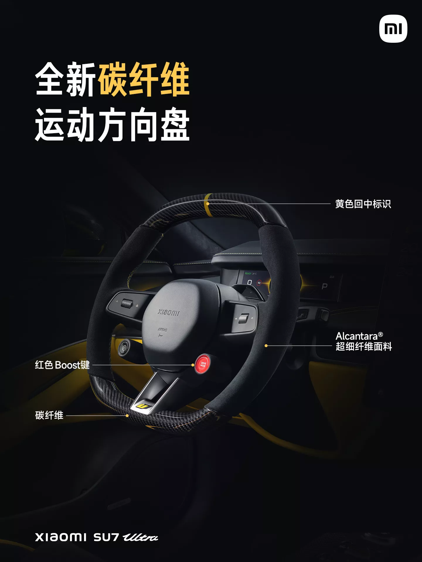 وتتميز فئة شاومي SU7 Ultra الجديدة بتحديثات خاصة في المقصورة كذلك، بما يشمل مقود جديد مسطح من الأسفل والأعلى، بلمسات كربونية وزخرفات من مادة ألكانتارا الفاخرة، والتي نراها في مختلف أنحاء المقصورة، كما تأتي السيارة بشاشة عرض على الزجاج الأمامي، وتصميم جديد لنظام المعلومات الترفيهية ضمن لمسات أخرى.
