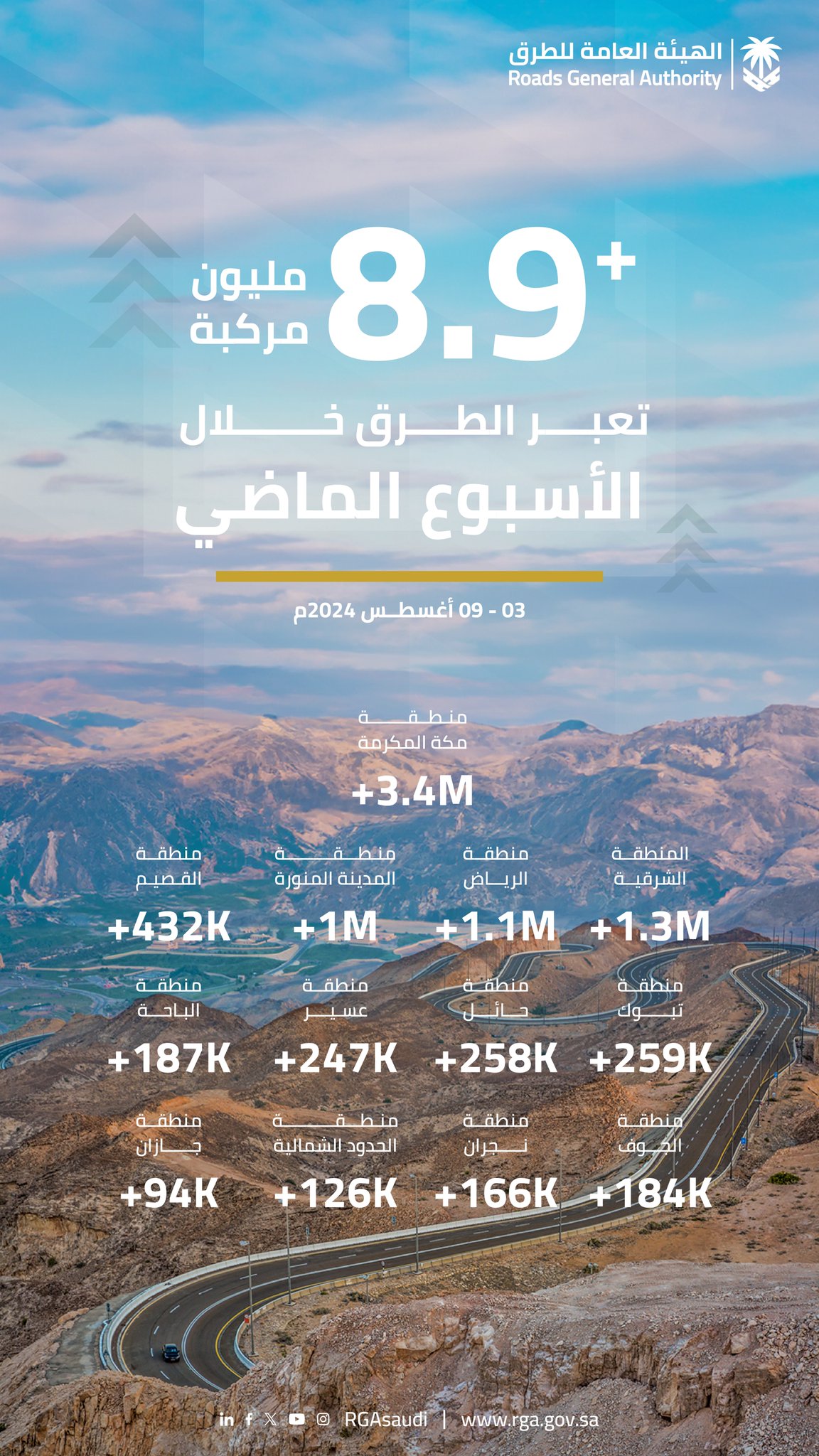 8.9 مليون مركبة عبرت شبكة طرق المملكة