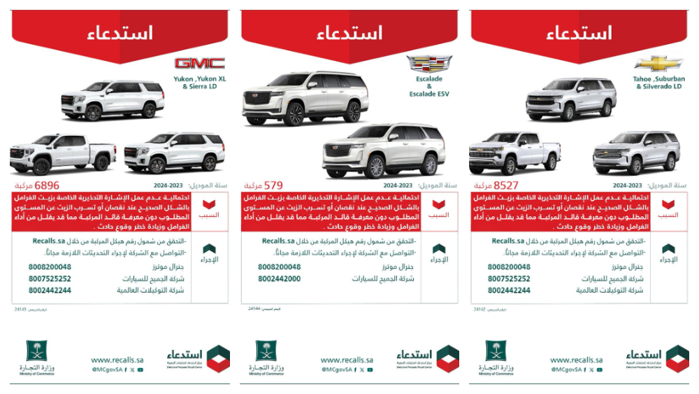 أعلنت وزارة التجارة عن استدعاء 16,002 مركبة شفروليه وGMC وكاديلاك موديلات ما بين عامي 2023 – 2024، لاحتمالية عدم عمل الإشارة التحذيرية الخاصة بزيت الفرامل بالشكل الصحيح عند نقصان أو تسرب الزيت عن المستوى المطلوب دون معرفة قائد المركبة.