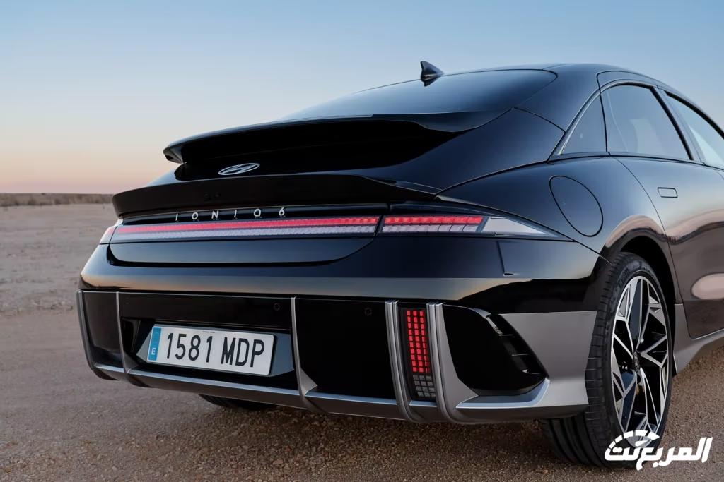 وبالنظر إلى صور هيونداي ايونيك 6 من الجانب فنرى من خلالها اللمسات الديناميكية والخطوط التي تمتد على طول الواجهة الجانبية وتعمل على تعزيز الأداء، فيما نرى انسيابية التصميم من خلال خط السقف المسحوب بحدة للخلف مع مقابض الأبواب ذاتية الإخفاء، وشملت أبرز التجهيزات الخارجية: