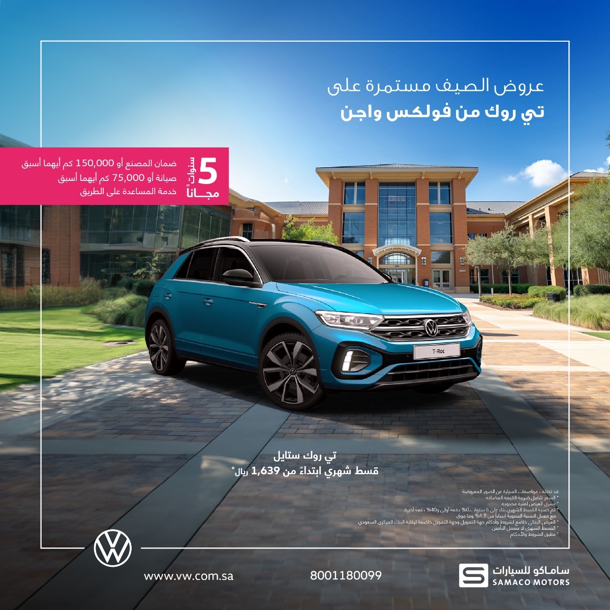 - العرض على سيارة تي روك 2024 بقسط شهري يبدأ من 1,639 ريال شامل الضريبة ولا يشمل التأمين الذي يختلف بحسب العيمل.