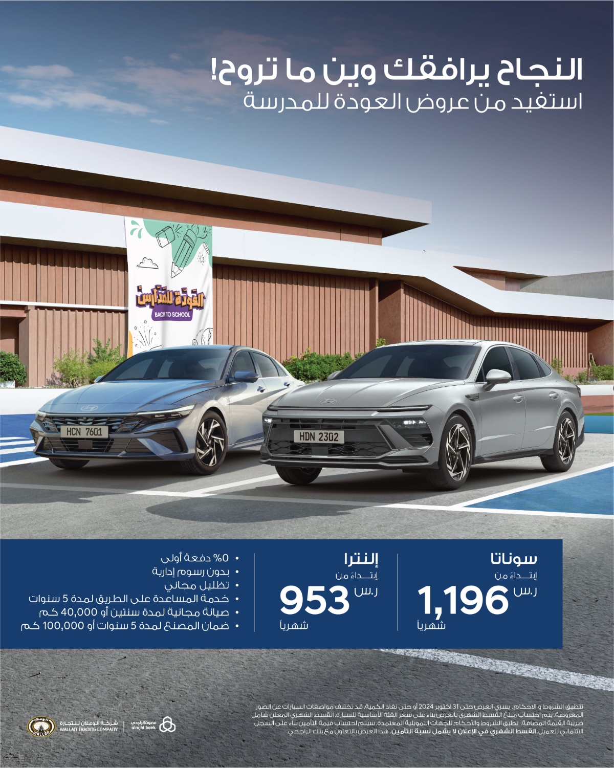 عروض هيونداي تقسيط مقدمة من الوعلان بالتعاون مع مصرف الراجحي مستمرة لفترة محدودة حتى 31 أكتوبر أو نفاذ الكمية إليكم التفاصيل.
