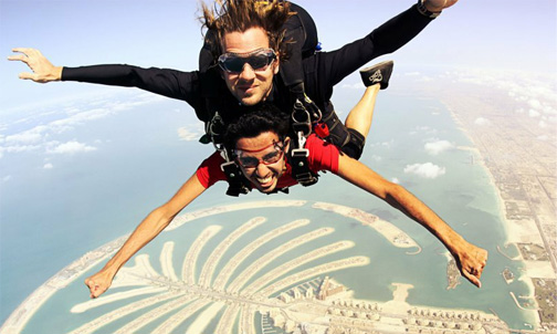 بطائرة الى سماء دبي ثم القفز بالمظلات من الطائرة للوصل الى الارض والهبوط في