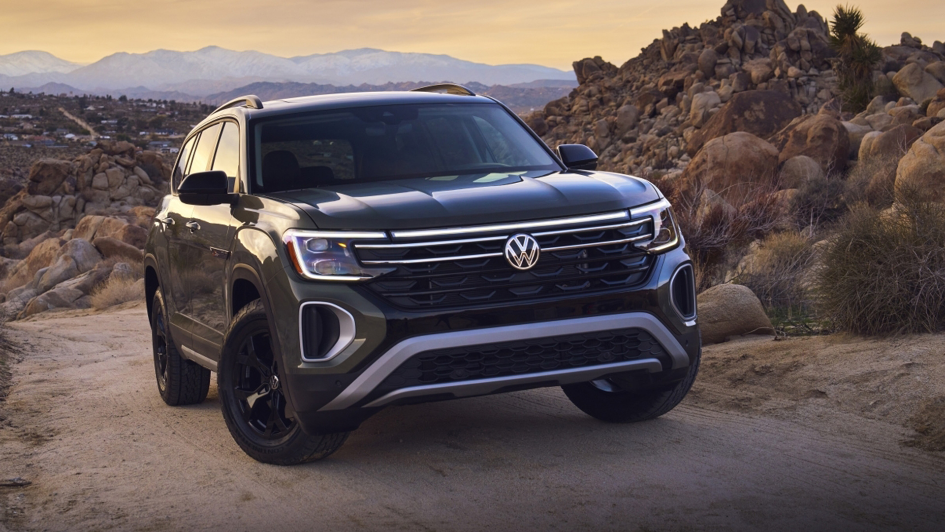 تظهر فولكس واجن اطلس بيك 2024 بطلاء خارجي باللون الأخضر المميز، مع العديد من اللمسات باللون الأسود والفضي، بدءاً بمقدمة السيارة حيث نشاهد الشبكة الأمامية الجديدة باللون الأسود اللامع مع شريطين من الكروم اللامع، مع لمسات رياضية باللون الفضي بالمصد الأمامي الجديد.