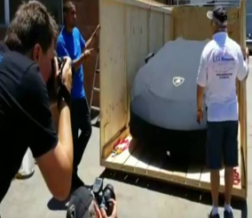 حيث غطيت لمبرجيني سينتيناريو رودستر بغطاء قماشي ووضعت في صندوق خشبي ليتم شحنها إلى الوكيل بكل حذر فهي سيارة ثمينة.