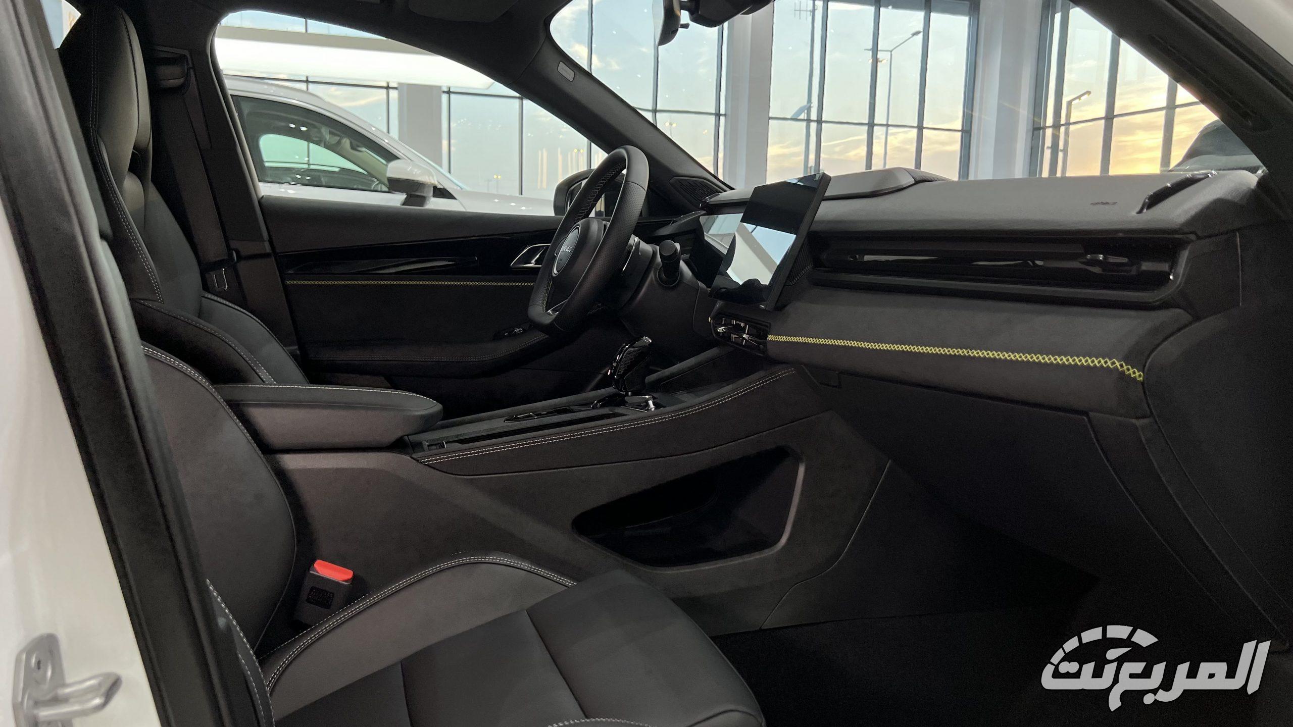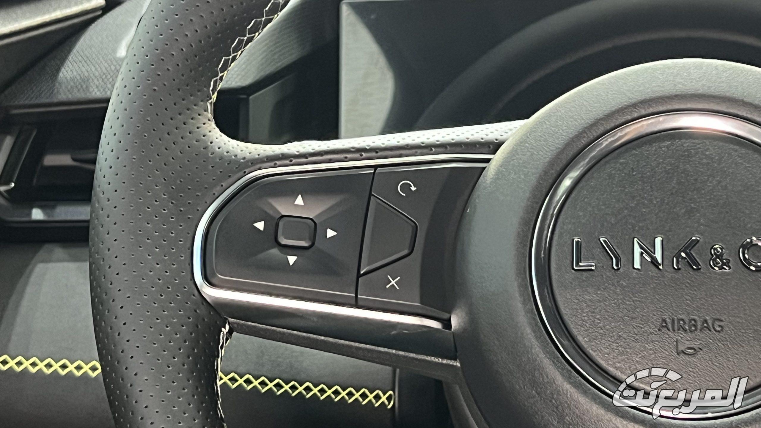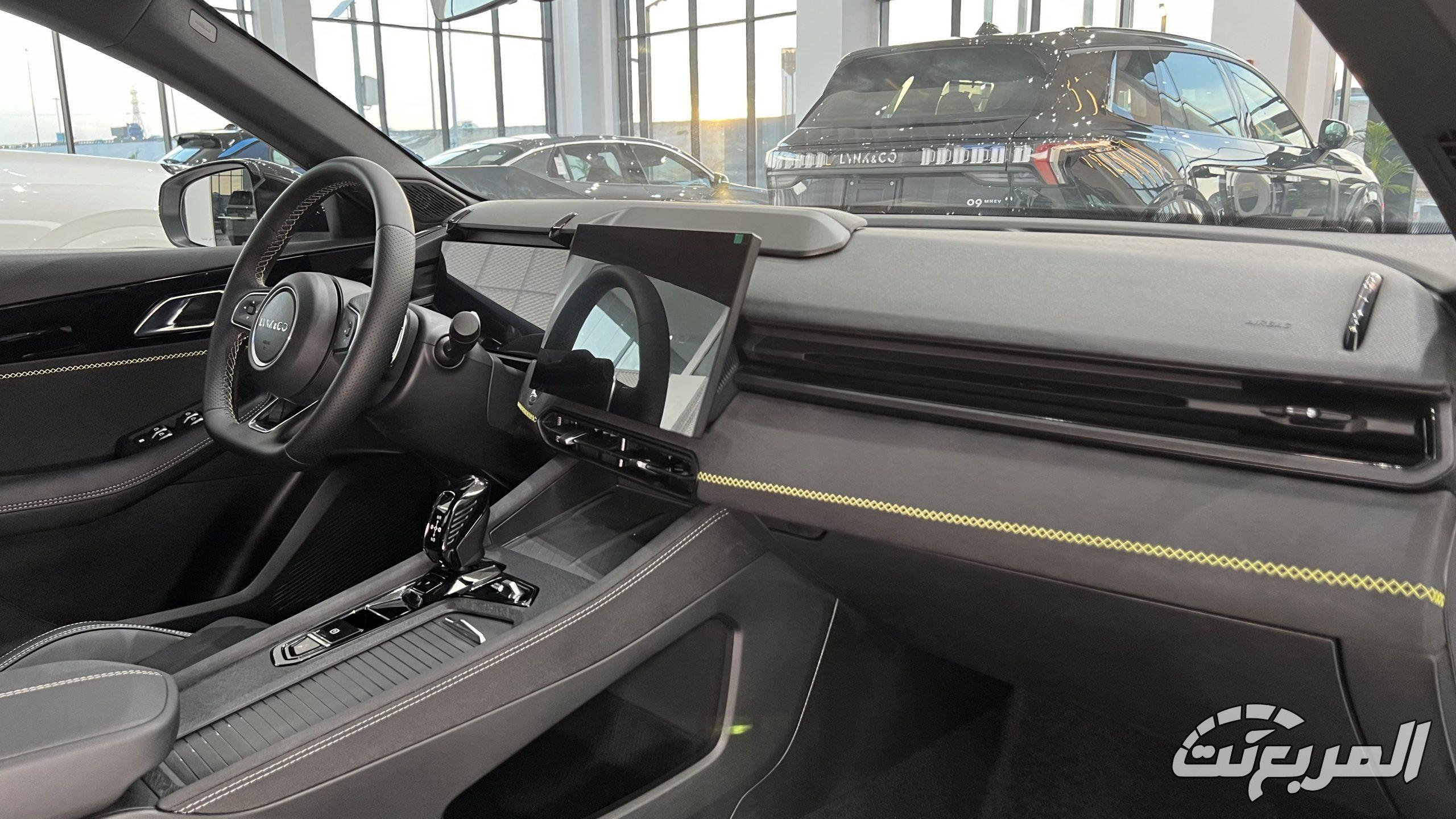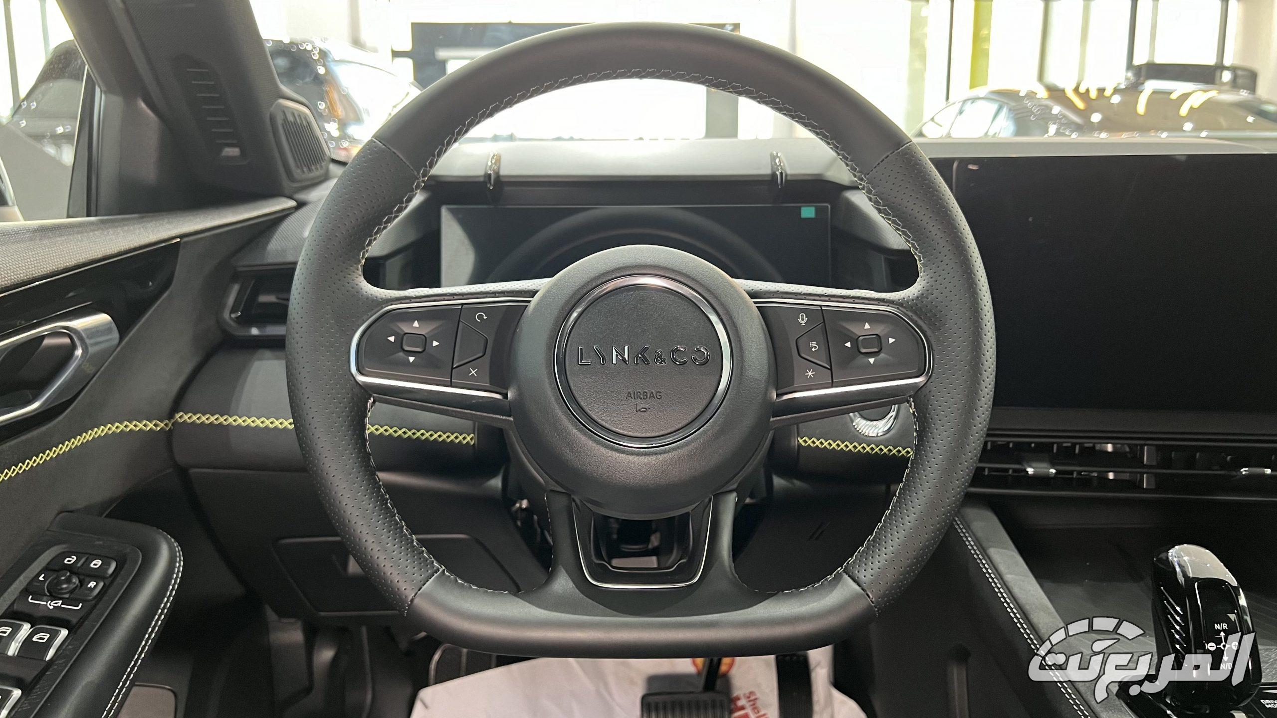 ننتقل من الخارج إلى الداخل حيث نرى المقصورة ذات الطابع الفاخر لـ لينك آند كو 03 2024 والتي تحمل تصميم عملي ورياضي يركز على السائق لتقديم تجربة حماسية على الطريق، كما تحصل على لمسات فخمة نراها في الخامات الجلدية على المقاعد مع أجزاء مختلفة من المقصورة.
