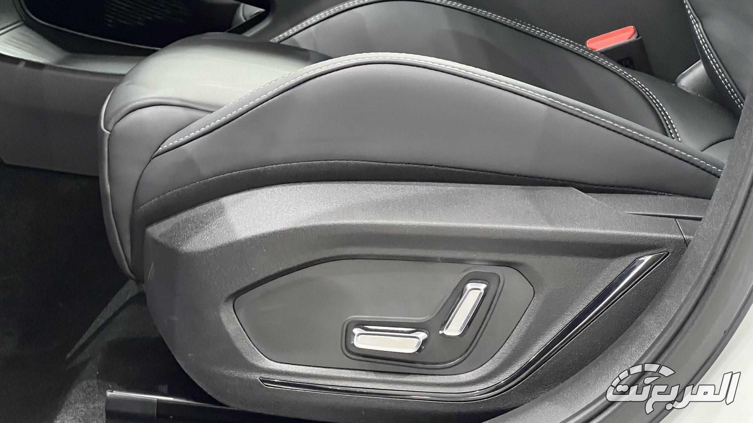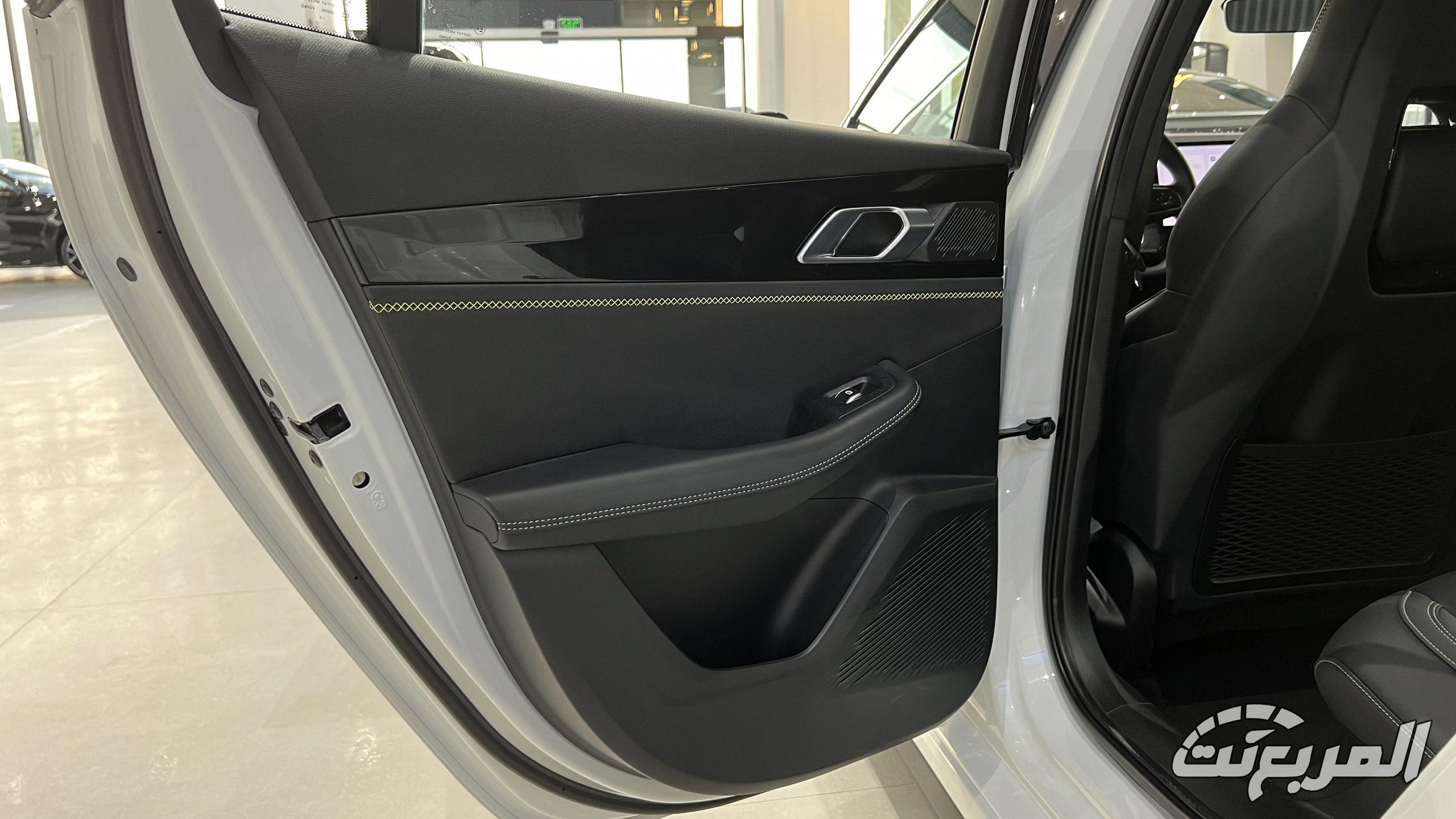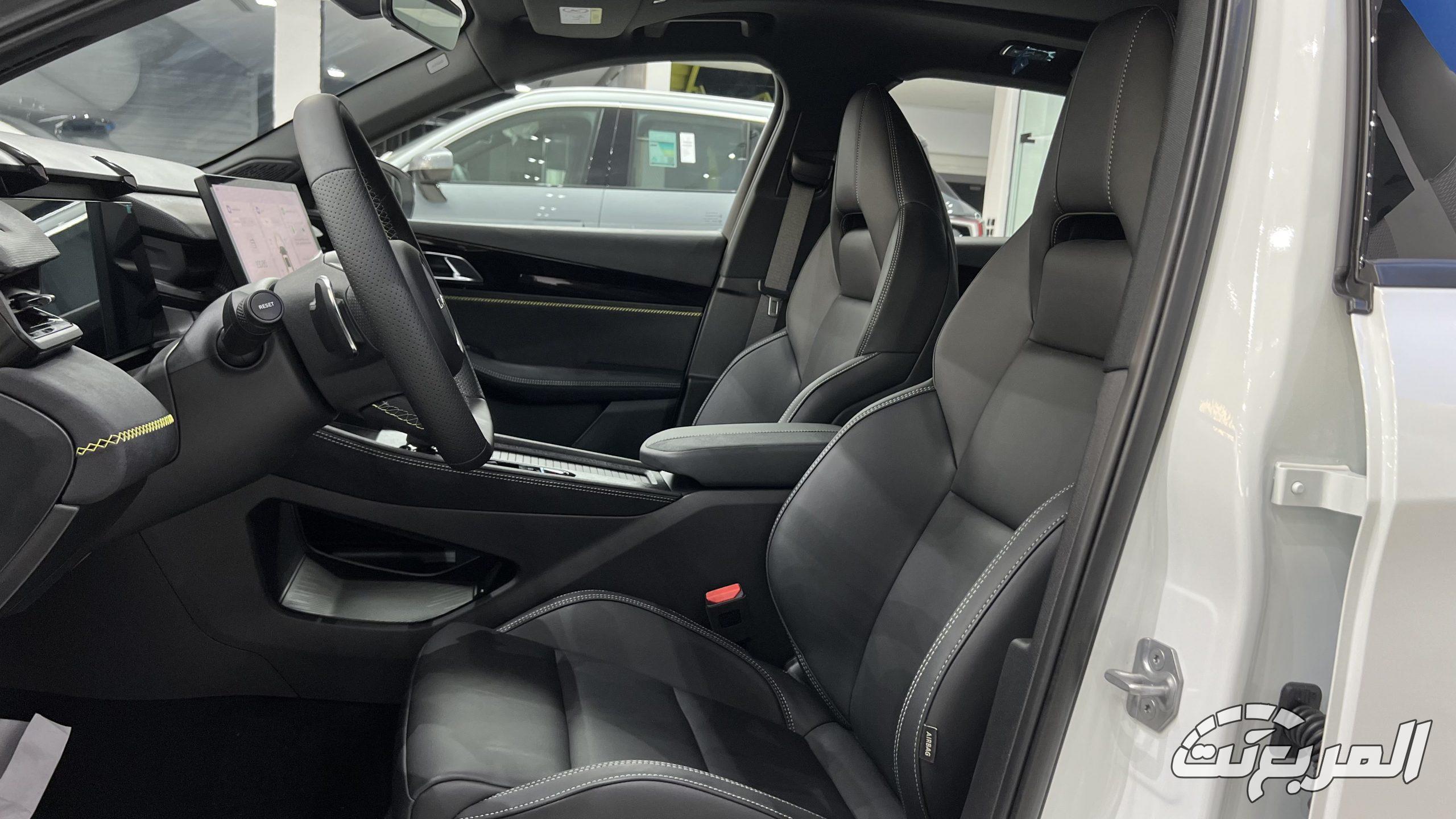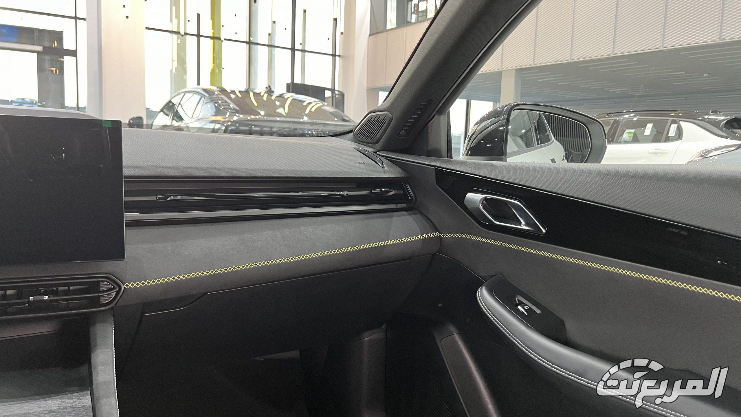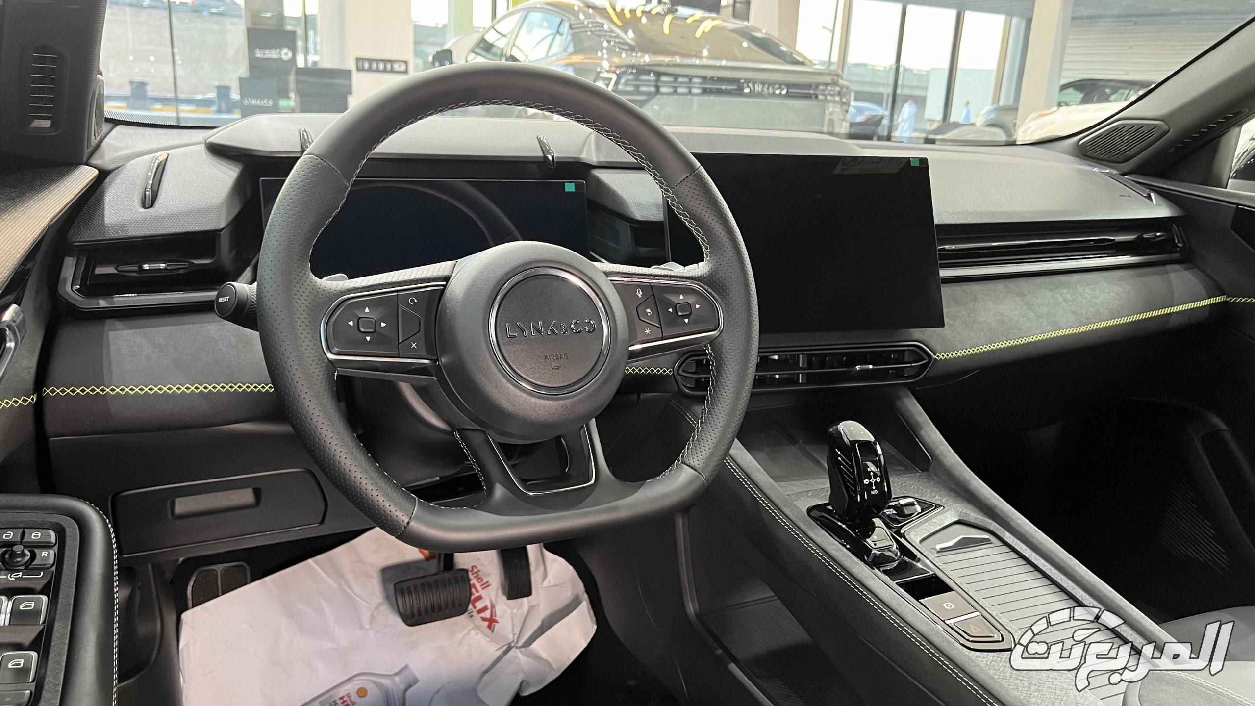 ننتقل من الخارج إلى الداخل حيث نرى المقصورة ذات الطابع الفاخر لـ لينك آند كو 03 2024 والتي تحمل تصميم عملي ورياضي يركز على السائق لتقديم تجربة حماسية على الطريق، كما تحصل على لمسات فخمة نراها في الخامات الجلدية على المقاعد مع أجزاء مختلفة من المقصورة.