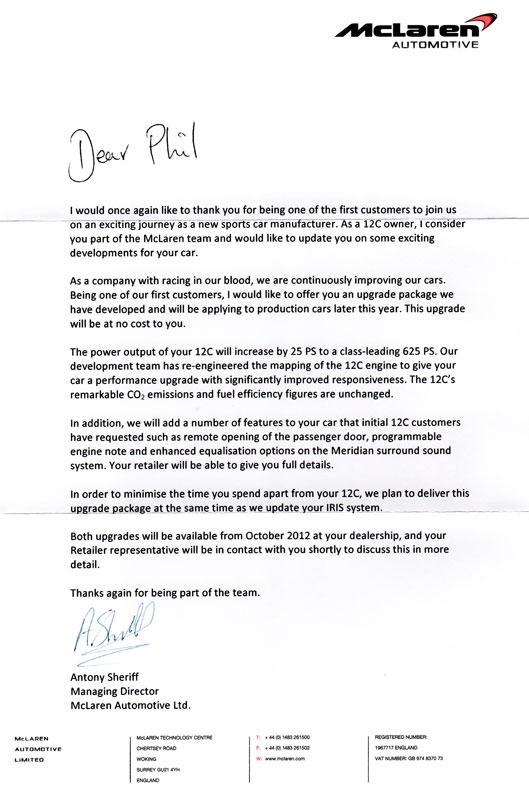 المربع نت – اعلنت شركة ماكلارين للسيارات عن اطلاق نسختها الجديدة من سيارتها مكلارين رسمياً عن تحديثات جديدة لـ2013 MP4-12C والتي سيتم إضافتها لجميع مالكي MP4-12C الحاليين دون أي مبالغ إضافية كذلك نشرت صور للسيارة مع صورة من الخطاب الذي يظهر فيه التوضيح لجميع العملاء يذكر ان الشركة تفكر حالياً في افتتاح فرع تصنيع رسمياً في الشرق الاوسط ومن المتوقع ان يكون في البحرين او قطر او دبي