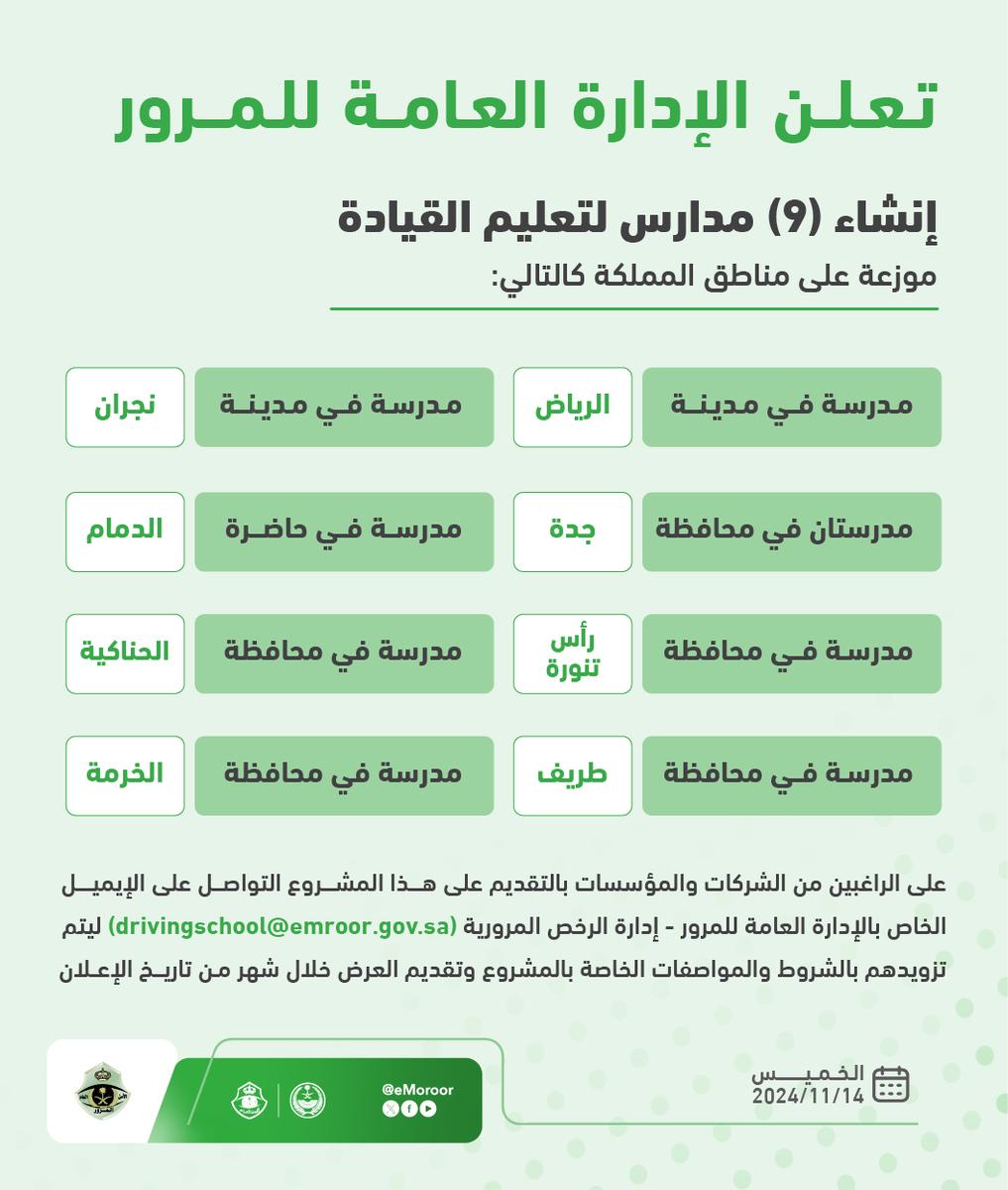أعلنت الإدارة العامة للمرور عن إنشاء 9 مدارس لتعليم القيادة موزعة على مناطق المملكة كالتالي: