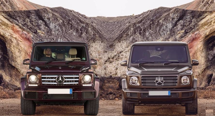 للوهلة الأولى، ستشعر بأنه لا يوجد اختلاف بين G-Class السابقة (على اليسار) والجديدة منها (على اليمين)، فعناصر التصميم الرئيسية يتشاركان فيها ويتضمن ذلك المصابيح الأمامية المُستديرة والشبك الأمامي والرفارف العضلية.