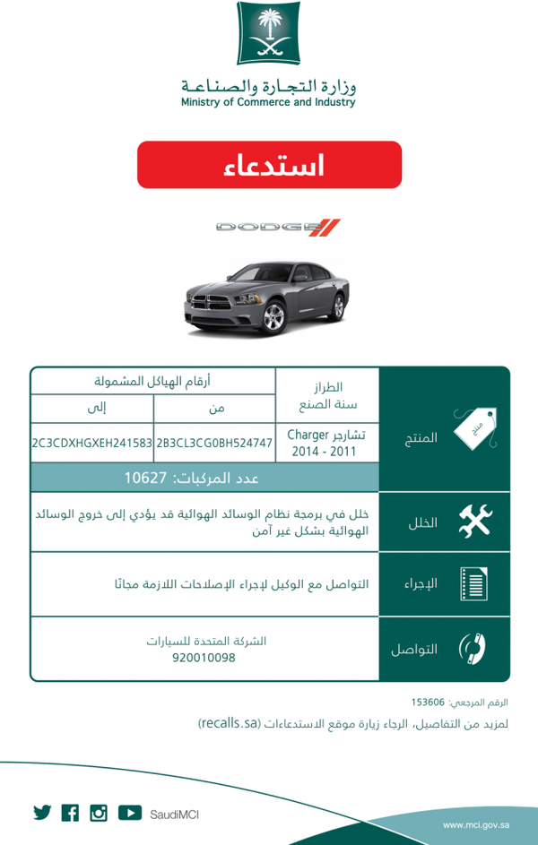 المربع نت – استدعت وزارة التجارة والصناعة 10627 سيارة من نوع “دودج/ تشارجر”، موديلات 2011 و2012 و2013 و2014م، بعد اكتشاف خلل في برمجة نظام الوسائد الهوائية “الإيرباك”، يؤدي إلى خروجها بطريقة غير آمنة ودعت الوزارة أصحاب هذه المركبات إلى التواصل مع الشركة المتحدة للسيارات، وهي الوكيل المورد لسيارات “دودج/ تشارجر”، لإجراء الصيانة اللازمة مجاناً.