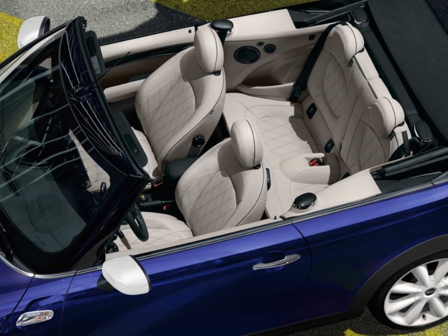 تأتي ميني المكشوفة القياسية بمقاعد رياضية بمزيج من الجلد والقماش باللون أسود الكربون المتلألئ، واللون العام لأسطح المقصورة هو أسود بيانو أو رمادي بشكل مربعات، وتوجد شاشة 8.8 بوصة تعمل باللمس لنظام المعلومات والترفيه وعجلة قيادة رياضية مكسوة بالجلد ومتعددة الوظائف، ونظام إضاءة محيطية متعددة الألوان.