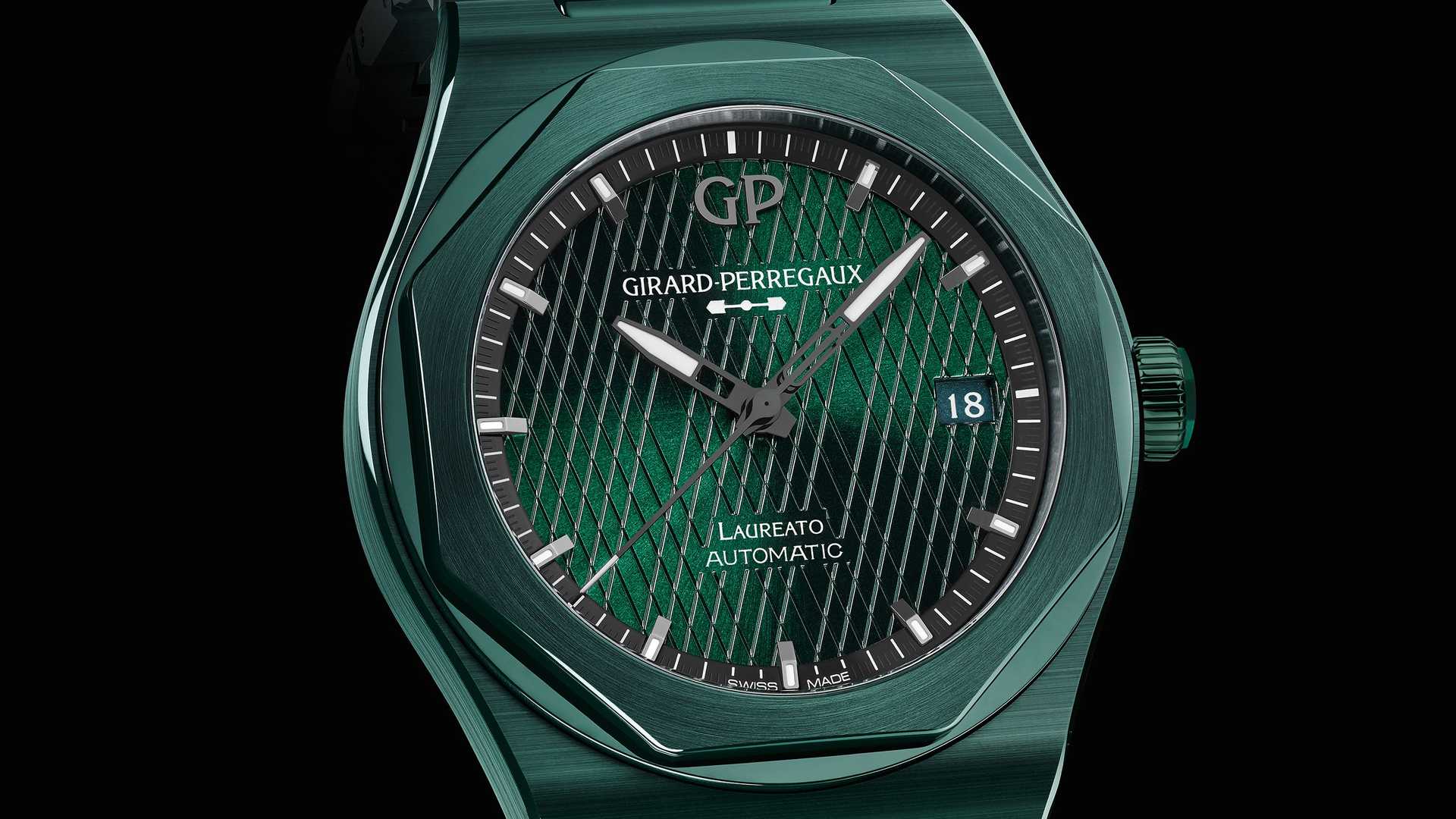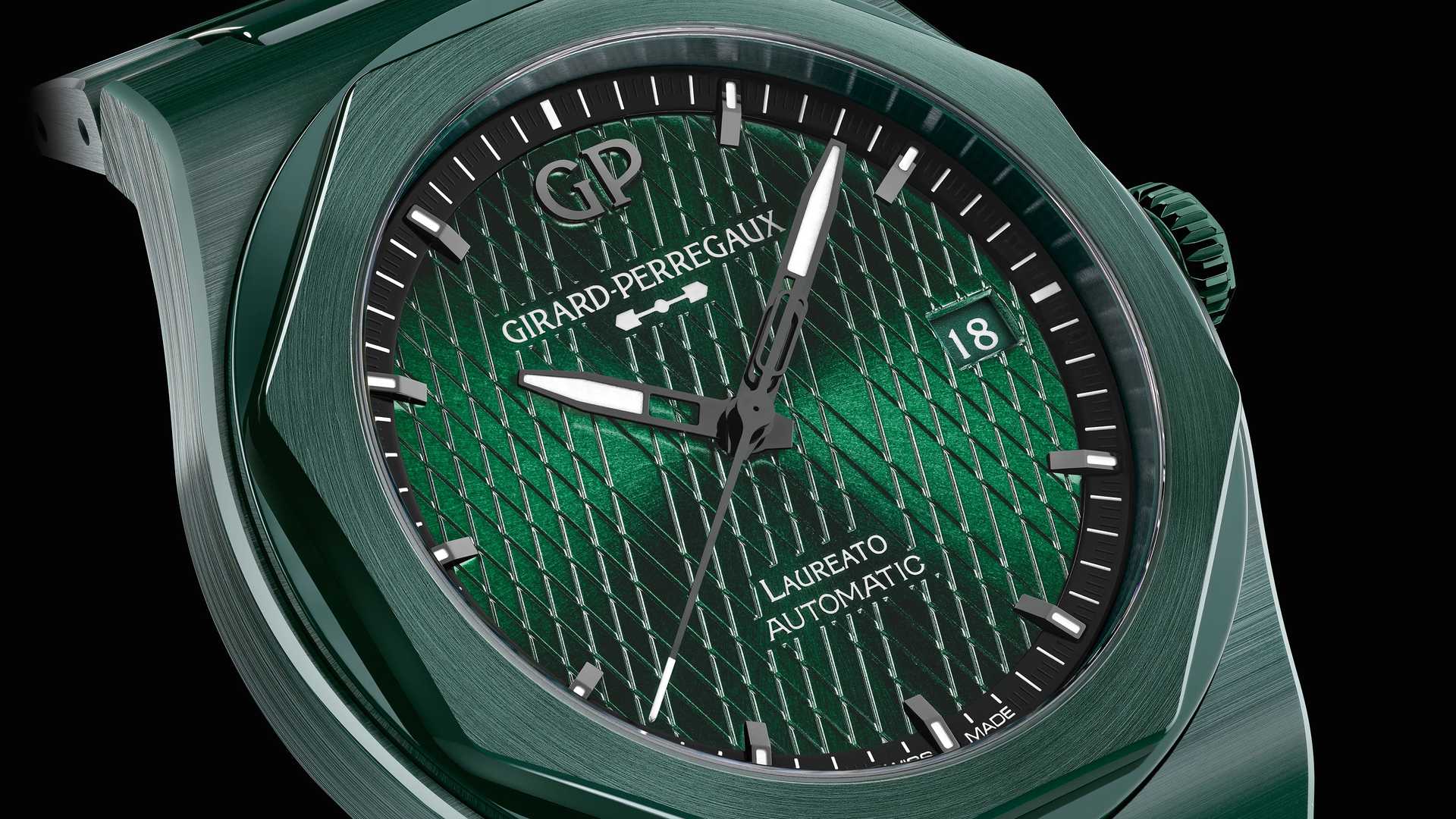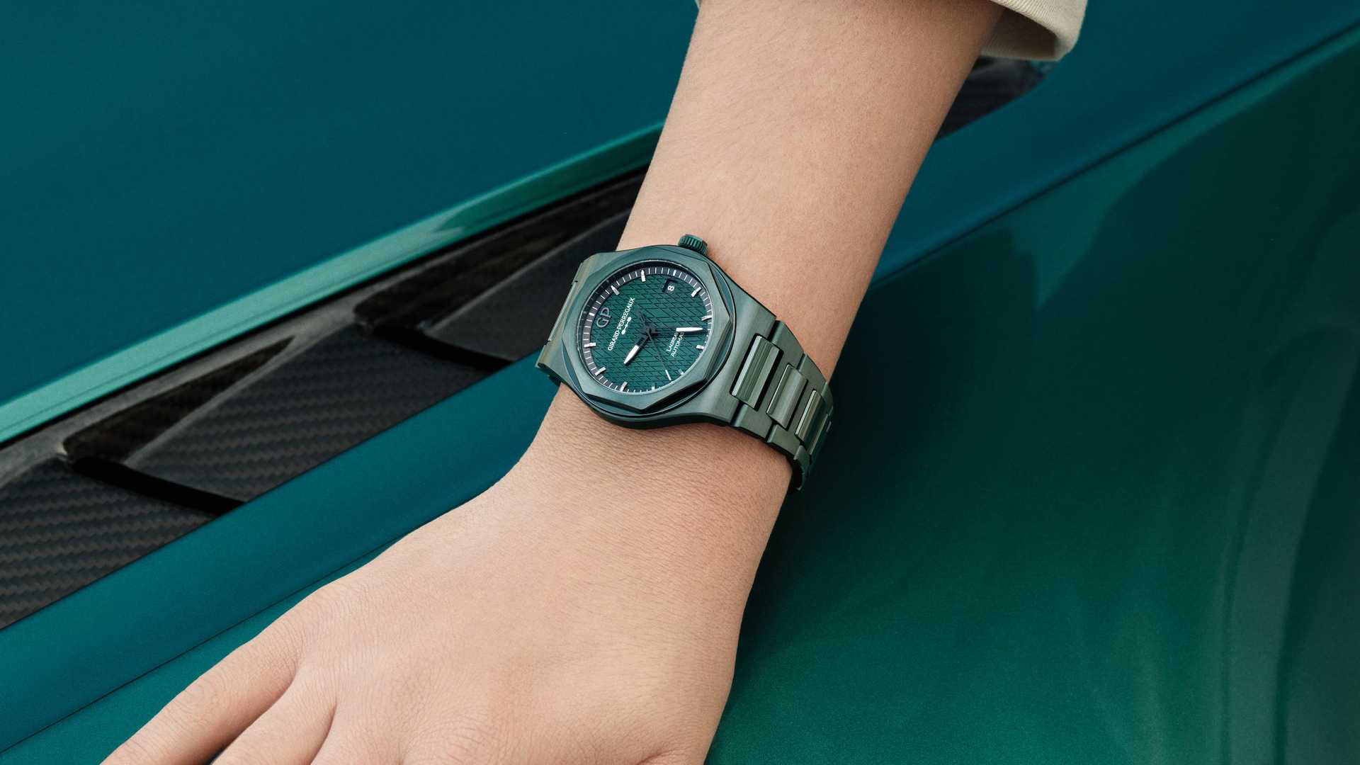 ويبدو أن التعاون بين الشركتين أصبح تقليداً سنوياً الآن، مع الإعلان عن إصدار G-P Laureato استون مارتن الأخضر السيراميكي الجديد بغلاف وسوار مصنوعين من السيراميك خفيف الوزن، وتصميم ماسّي رائع على قرص الساعة.