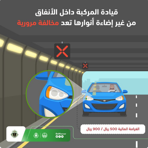 ونشرت الإدارة إنفوجراف عبر حسابها الرسمي على تويتر تؤكد فيه أن قيادة السيارة داخل الإنفاق من غير إضاءة أنوارها تعد مخالفة مرورية، تتراوح قيمة غرامتها المالية ما بين 500 إلى 900 ريال.