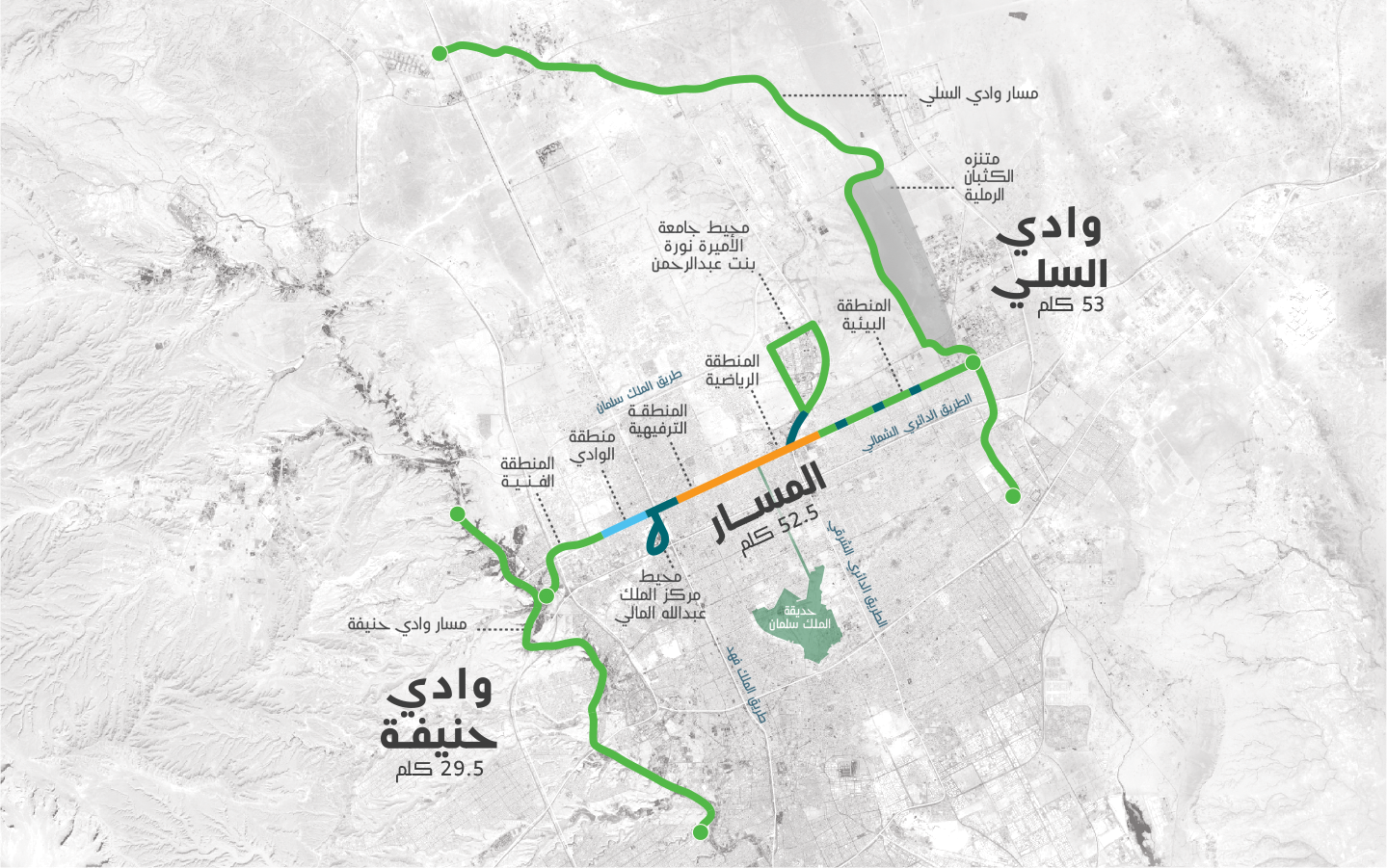 ويستهدف هذا المشروع، تشجع السكان على اتباع أنماط صحية في التنقل، ويحفزهم على ممارسة الرياضات المختلفة، كما يمتد المشروع بطول 135 كيلو متراً، ويربط بين وادي حنيفة في غرب المدينة ووادي السلي في شرقها، ويشتمل على مسارات آمنة ومشجرة للمشاة على طول امتداد المشروع.