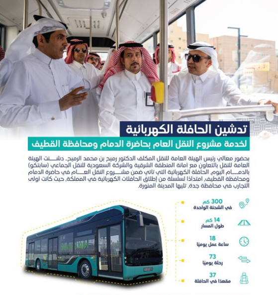 المربع نت – أعلنت الهيئة العامة للنقل، وبالتعاون مع أمانة المنطقة الشرقية، والشركة السعودية للنقل الجماعي سابتكو، عن تدشين الحافلة الكهربائية لخدمة مشروع النقل العام بالحافلات في حاضرة الدمام ومحافظة القطيف.
