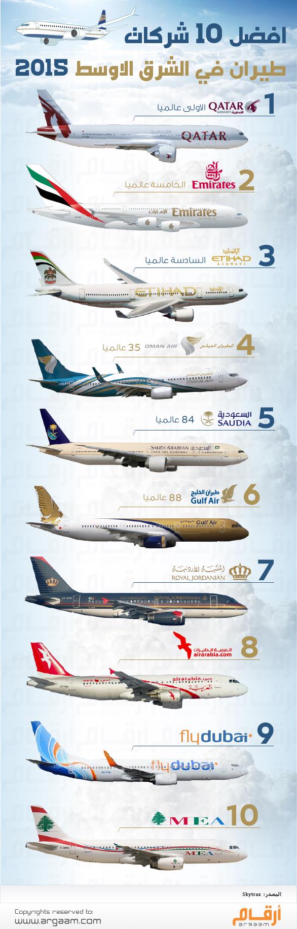 وفيما يلي ترتيب أفضل 10 شركات طيران في الشرق الأوسط: