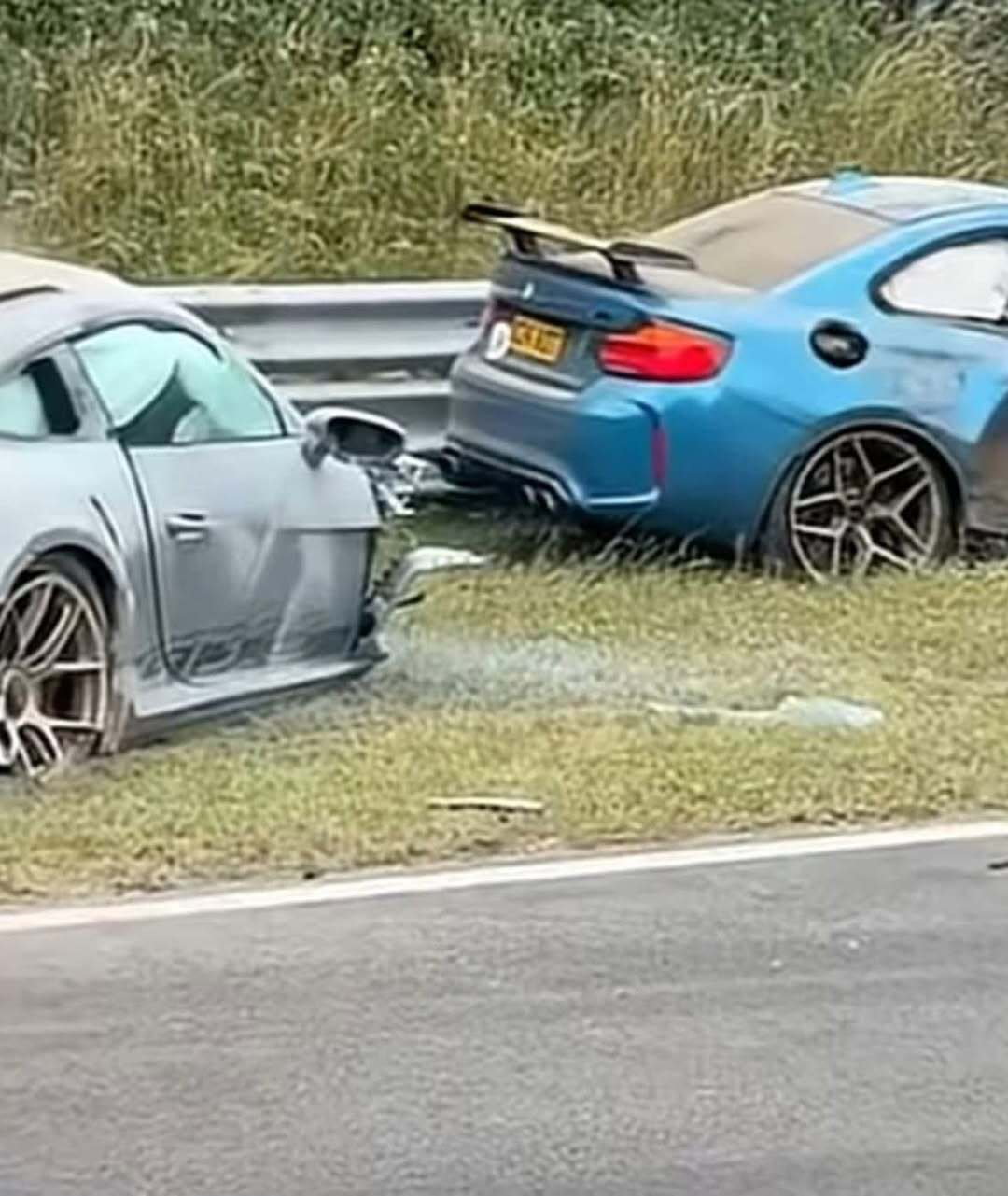 القصة تبدأ من داخل GT3 RS التي كانت تنطلق بسرعة جنونية وتقترب بسرعة من سيارة بي إم دبليو أبطأ تحمل لوحات بريطانية. ومع اقتراب البورشه، بدت البي إم وكأنها تتحرك قليلاً إلى اليمين، في إشارة ربما إلى نيتها فتح المجال للسيارة الأسرع.