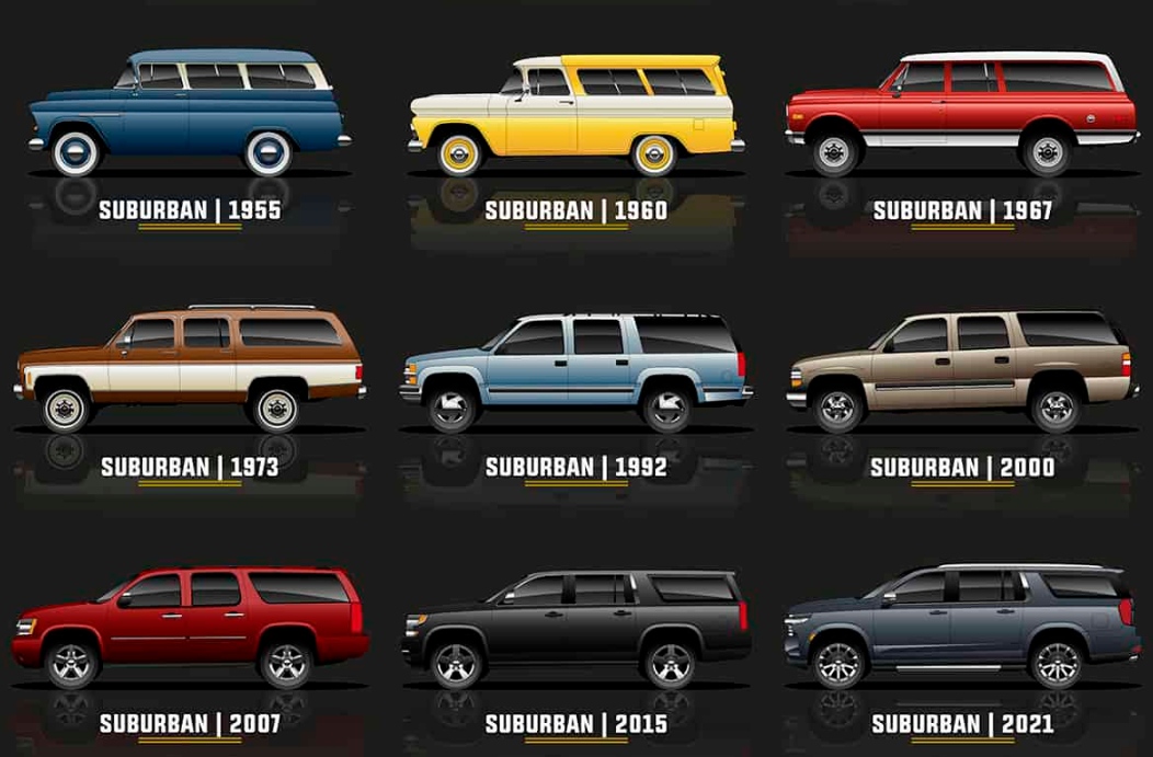 ومع ذلك، كانت هناك سوبربان تسع 8 أفراد وفي بعض النسخ تسع 9 أفراد، وكانت عالية الركوب، قُدمت لأول مرة في 1935 ميلادية، وتطورت السيارة من ناحية التصميم عبر السنوات وصارت قريبة جدا من حيث الحجم والمفهوم في الستينيات عند المقارنة مع المنافسين أمثال جيب واجونير، لكن منذ السبعينيات، أصبحت سوبربان عملاقة تنافس في فئة اس يو في كاملة الحجم، ومن ثم أصبحت الاختيار الأول للعائلات الكبيرة التي تكثر من زيارة الأقارب.