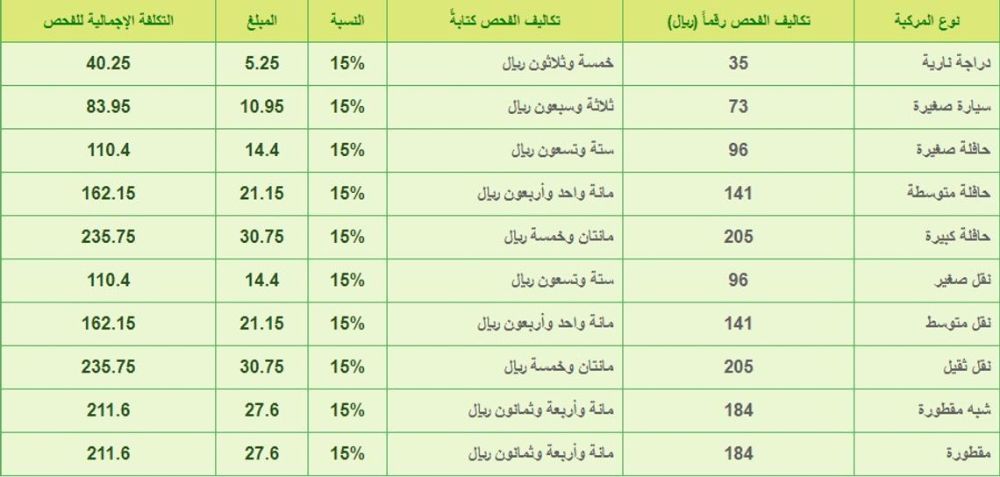 المربع نت – أعلنت الإدارة العامة للفحص الفني الدوري للسيارات عن الأسعار الجديدة لخدماتها التي تُقدّم بمحطات الفحص الفني للسيارات في جميع مناطق المملكة؛ تماشياً مع تطبيق الزيادة الجديدة في ضريبة القيمة المضافة من 5% إلى 15% منذ بداية الشهر الحالي.