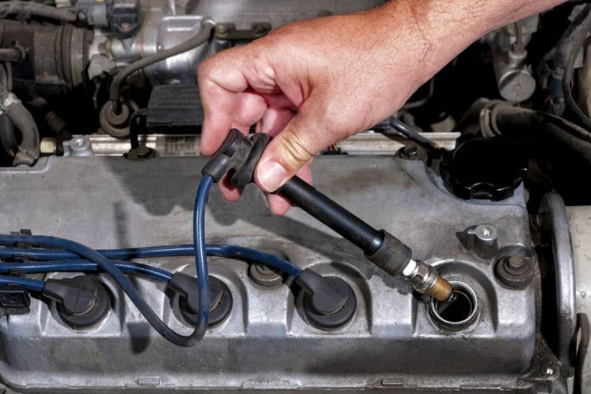 - بعد رفع المحرك، ستجد أمامك أسلاك شمعات الاحتراق (البواجي) قم بنزع أول سلك عن طريق فك المسمار ثم سحب السلك نحو الأعلى.