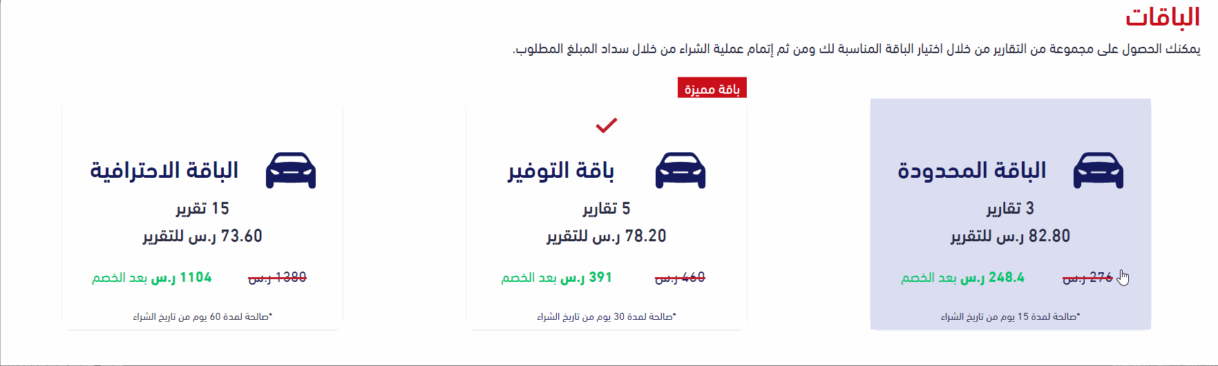 للراغبين في عدم شراء باقة كاملة، فإن سعر تقرير موجز للسيارة الواحدة هو 92 ريال فقط.