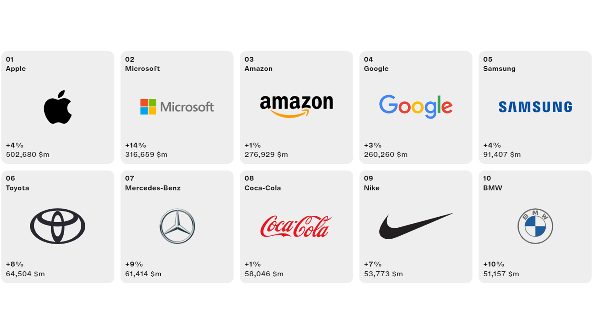 تضم هذه القائمة العديد من العلامات التجارية في مختلف المجالات مثل آبل وأمازون وسامسونج، واحتلت تويوتا المرتبة السادسة في القائمة للعام الثاني، متفوقة بذلك على باقي علامات السيارات، ومتقدمة على مرسيدس التي جاءت في المرتبة السابعة متقدمة مركزاً واحداً بالمقارنة بعام 2022.