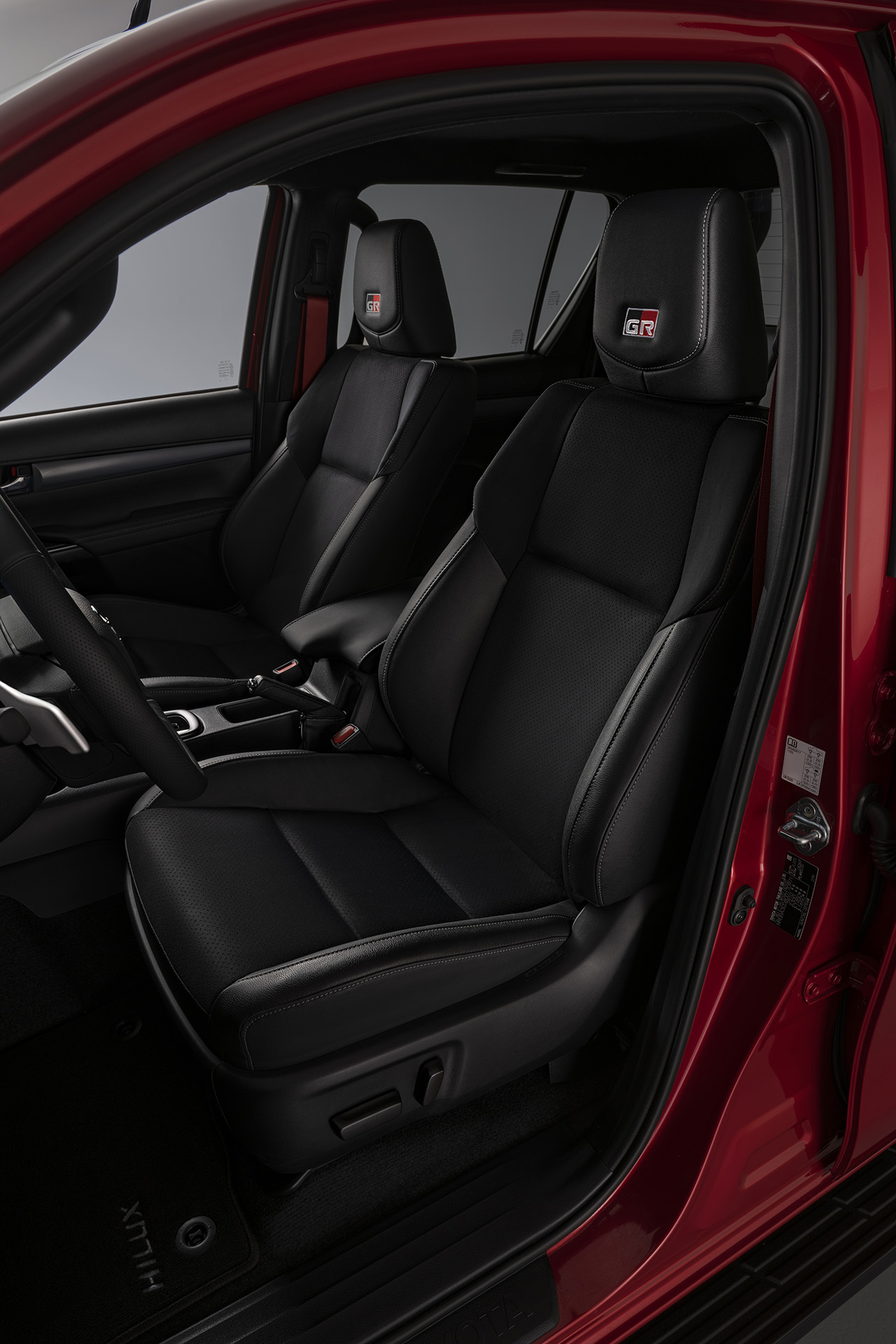بالانتقال إلى الداخلية سوف نجد أن هايلكس GR سبورت حصلت على داخلية باللون الأسود مع لمسات متعددة باللون الأحمر الداكن وشعارات GR المطرزة، بالإضافة إلى شاشة وسطية بقياس 8 إنش لنظام المعلومات الترفيهي.