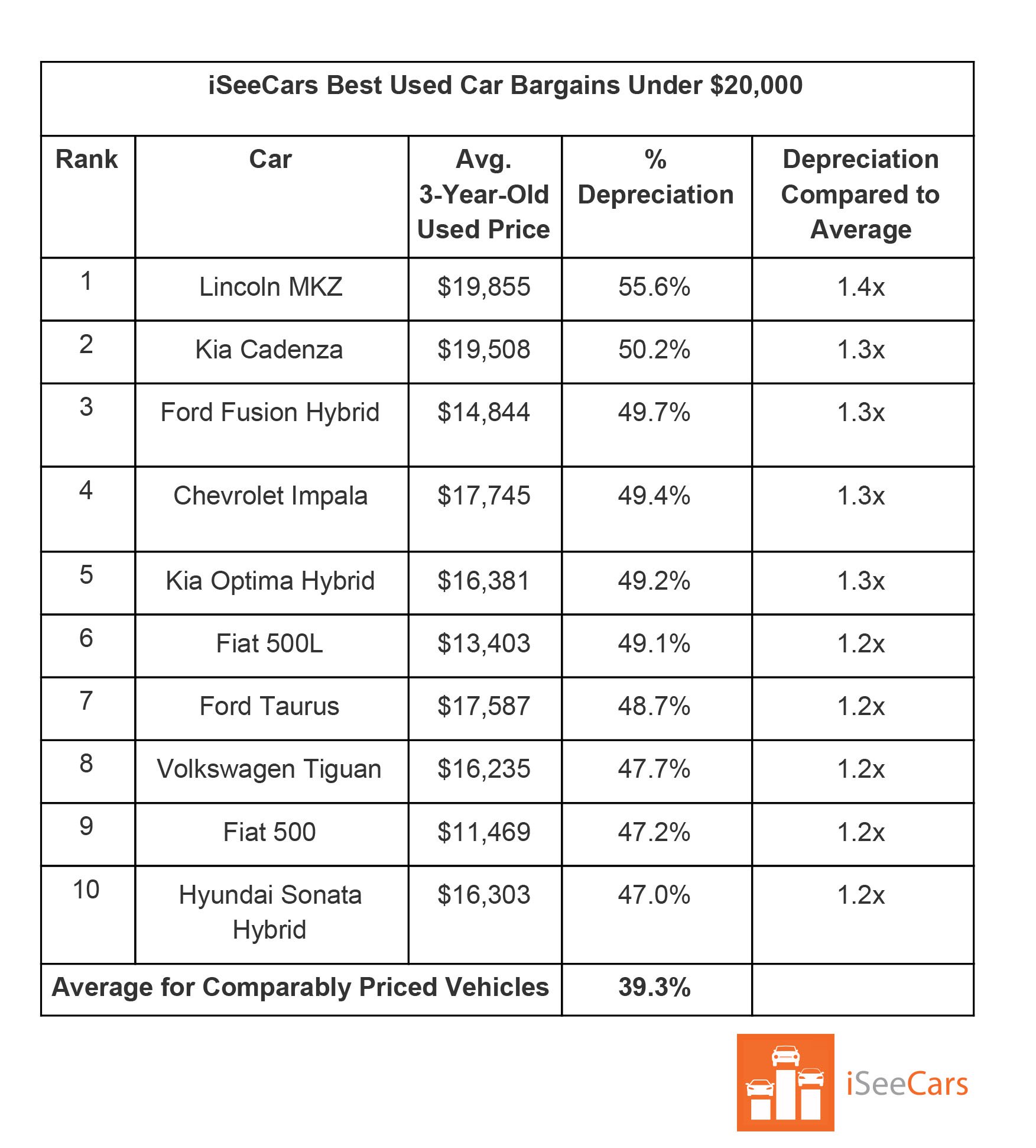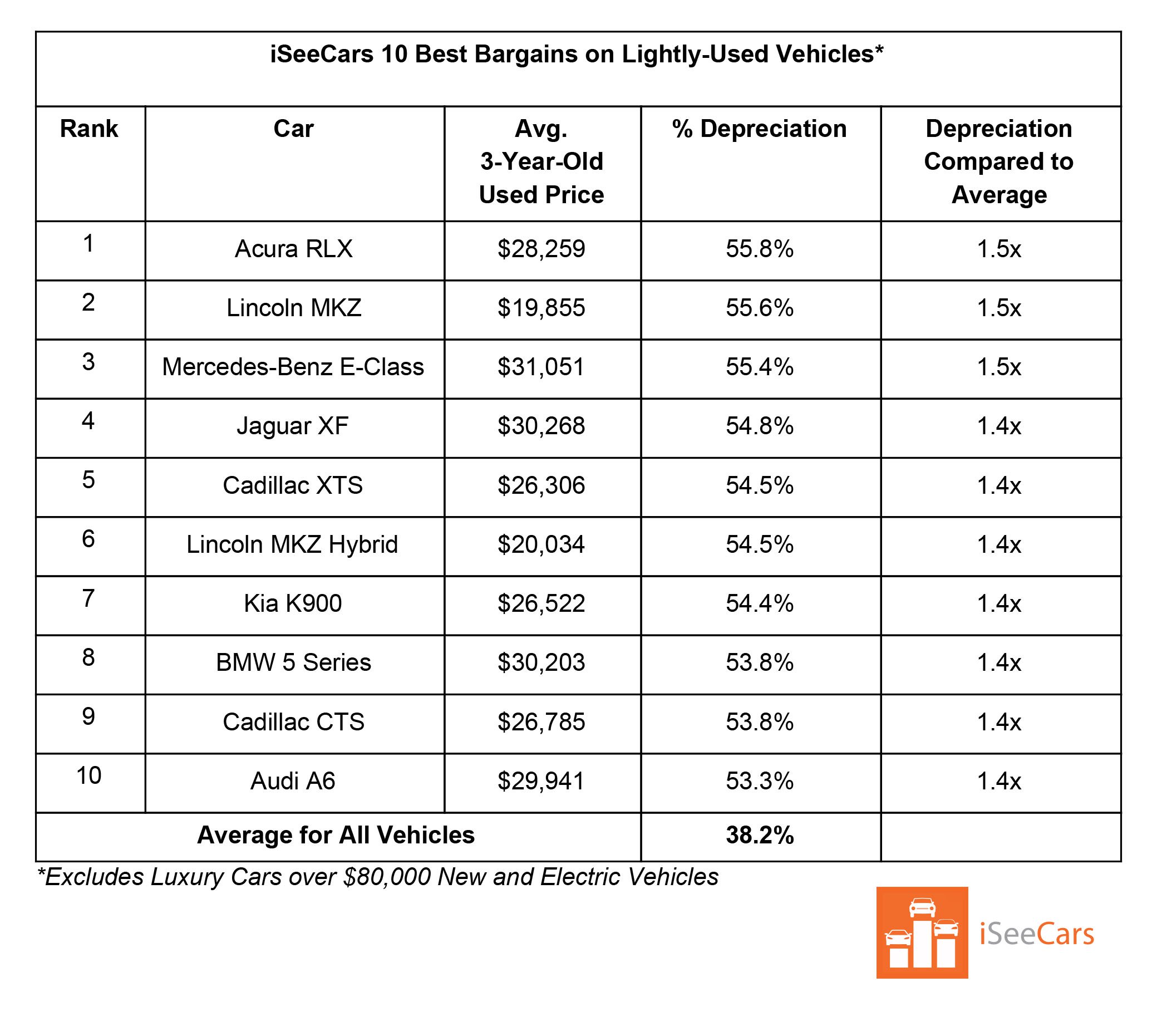 حسب الدراسة، يبلغ متوسط الهبوط في أسعار السيارات المستعملة بعد 3 أعوام 38.2% من أسعارها وهي جديدة، ولكن بعض الطرازات كانت أسوأ من الأخرى، حيث أن اكيورا RLX على سبيل المثال تفقد 55.8% من قيمتها الأصلية بعد 3 أعوام فقط، ما يعني أنه يمكن شراؤها كسيارة سيدان فاخرة مستعملة بأسعار تبدأ من 28,259$ (105,970 ريال)، وهو ما ينطبق أيضاً على لينكون MKZ التي تخسر 55.6% من قيمتها خلال الفترة نفسها لتبدأ أسعارها عند 19,855% (74,460 ريال).