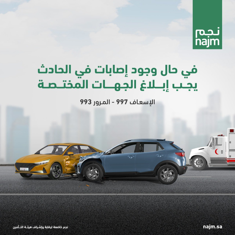 - يجب أن يكون لدى أحد طرفي الحادث وثيقة تأمين سارية المفعول قبل الاتصال برقم نجم للحوادث جدة والإبلاغ لمباشرة الحادث.