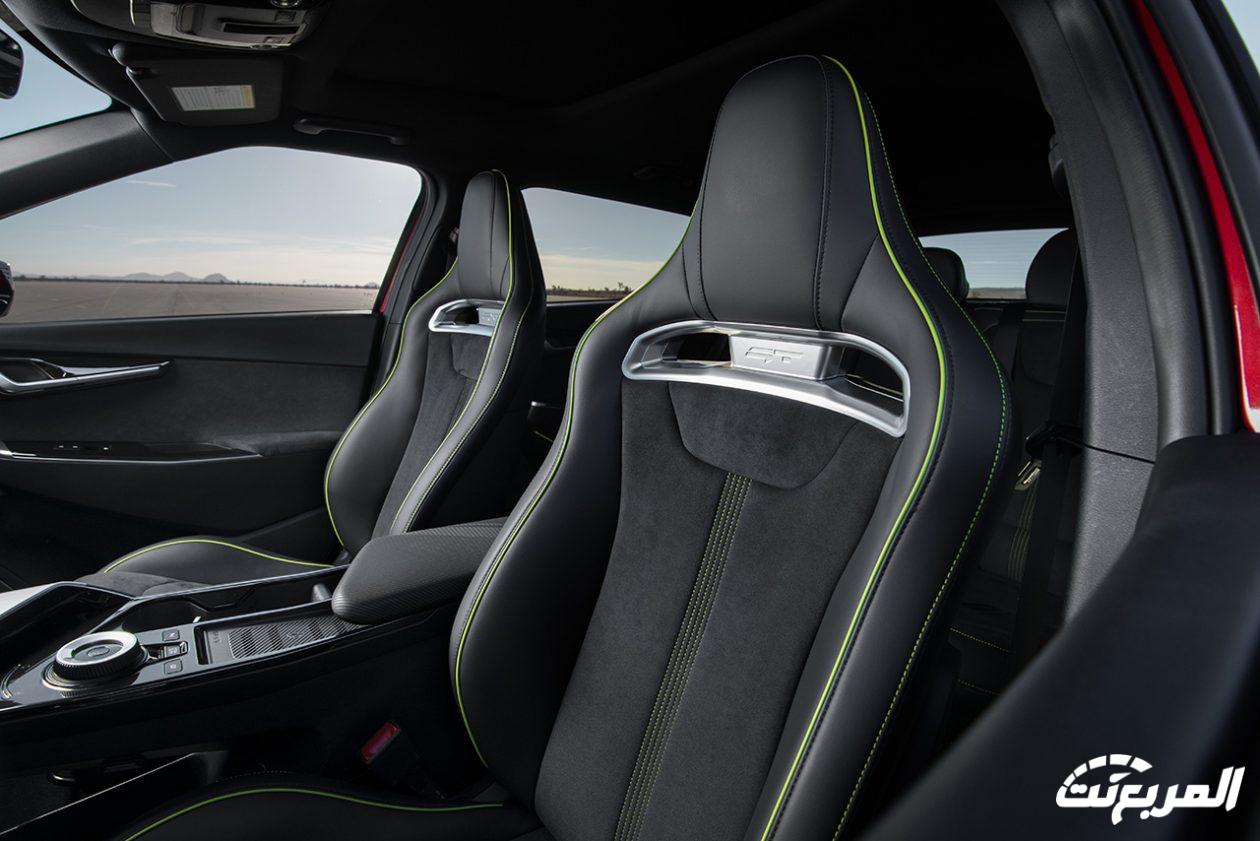 تتمتع كيا EV6 GT بحصولها على تعديلات خارجية ديناميكية متعددة لتعزيز أداء السيارة الكهربائية وتصميمها الخارجي الهجومي المميز، وتستمر هذه التعديلات بداخلية السيارة لنرى مقاعد رياضية جديدة مكسوة بمزيج بين الجلد النباتي وجلد الغزال مع لمسات متعددة باللون الأخضر اللامع.