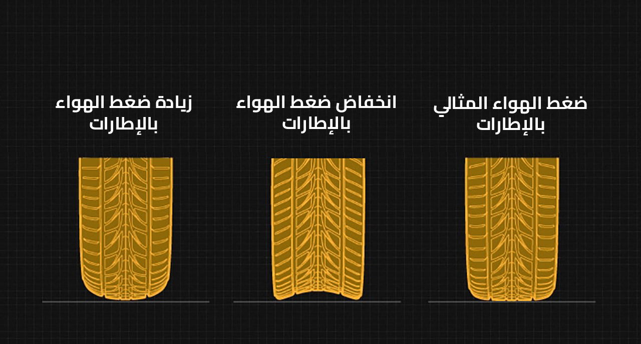 يؤدي نقص ضغط الهواء بالإطارات إلى زيادة الحمل على جانبي الإطارات مما يتسبب في زيادة التآكل بها، وعلى العكس تماماً حيث يتسبب الضغط الزائد بالإطارات إلى تآكل المقطع الوسطي من الإطارات بصورة زائدة عن باقي سطح الإطار مما يتسبب في تلفها أيضاً، وتشير الصورة التالية إلى تأثير ضغط الهواء على الإطارات.