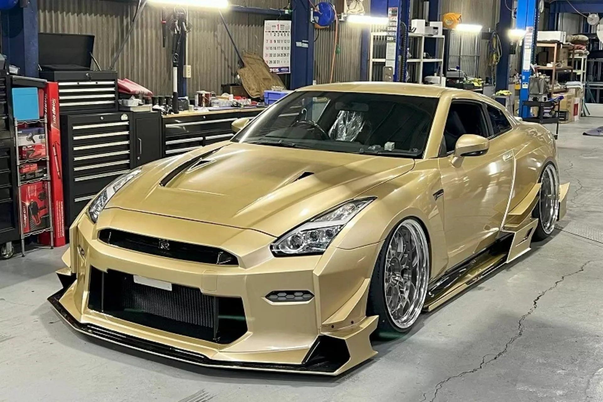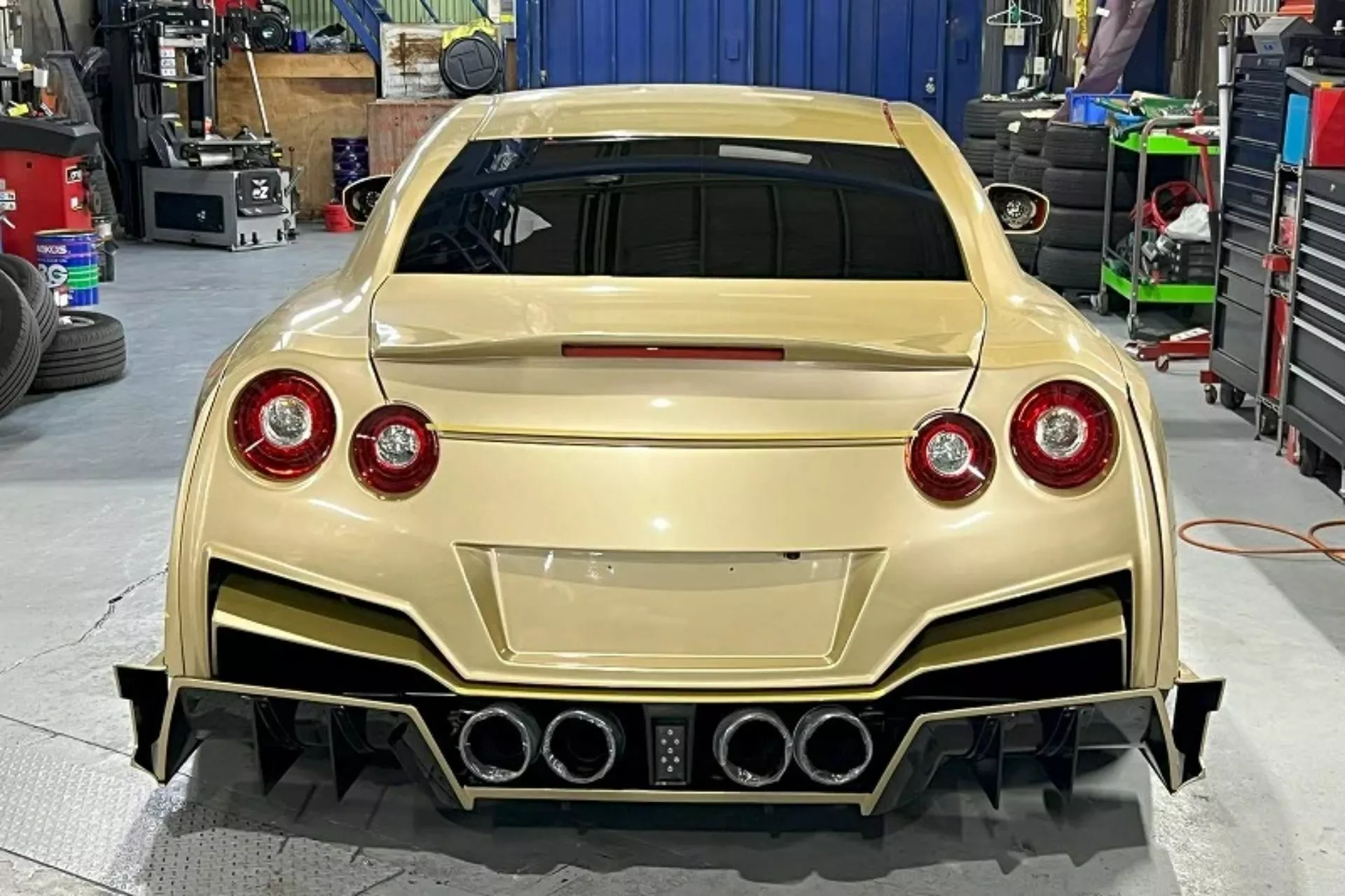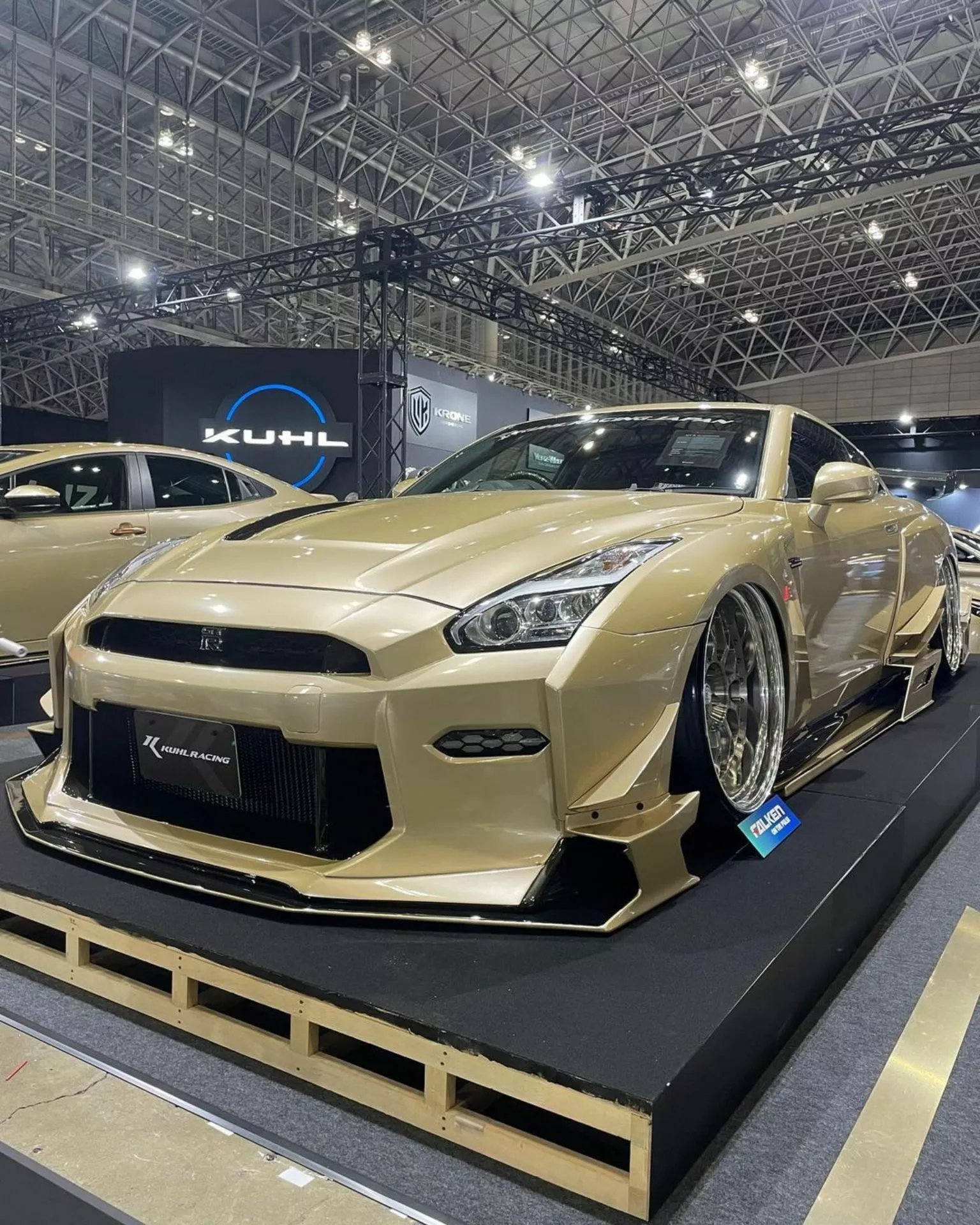 وننتقل لنيسان جي تي ار الذهبية البديعة، بمصدات معدلة ورفارف عريضة وغطاء محرك جديد، وجناح خلفي صغير على صندوق الأمتعة، وأربعة أنابيب عادم عملاقة، مع نظام تعليق منخفض بشدة.