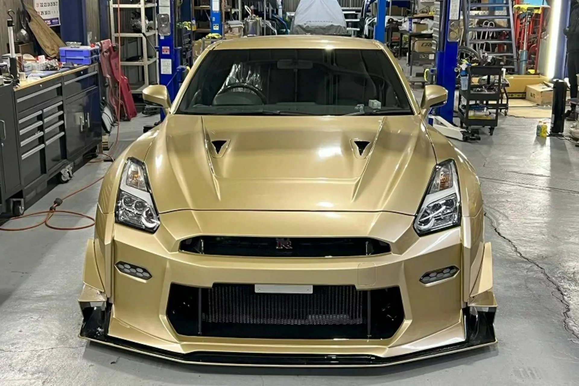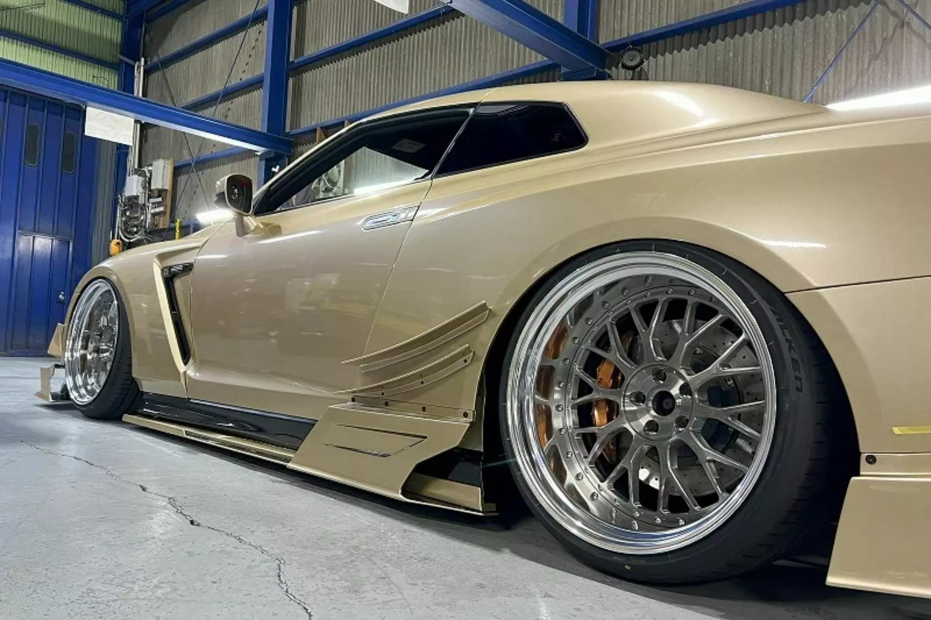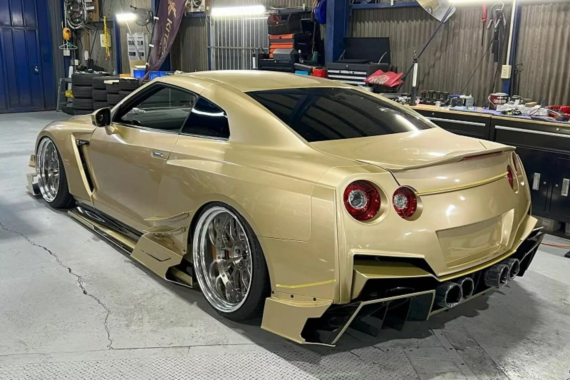 وننتقل لنيسان جي تي ار الذهبية البديعة، بمصدات معدلة ورفارف عريضة وغطاء محرك جديد، وجناح خلفي صغير على صندوق الأمتعة، وأربعة أنابيب عادم عملاقة، مع نظام تعليق منخفض بشدة.