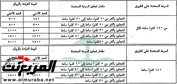 كما تم تعديل هامش مخالفات تجاوز السرعة لتبدأ من 150 ريال بدلاً من 300 ريال ، وتصل إلى 2000 ريال بدلا من 900 ريال كما يوضح الجدول التالي :