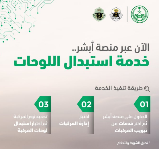 المربع نت – جددت منصة أبشر للخدمات الإلكترونية، عبر حسابها الرسمي على تويتر، التذكير بالخطوات التي يجب إتباعها لاستبدال لوحات المركبات إلكترونيًا عبر المنصة.