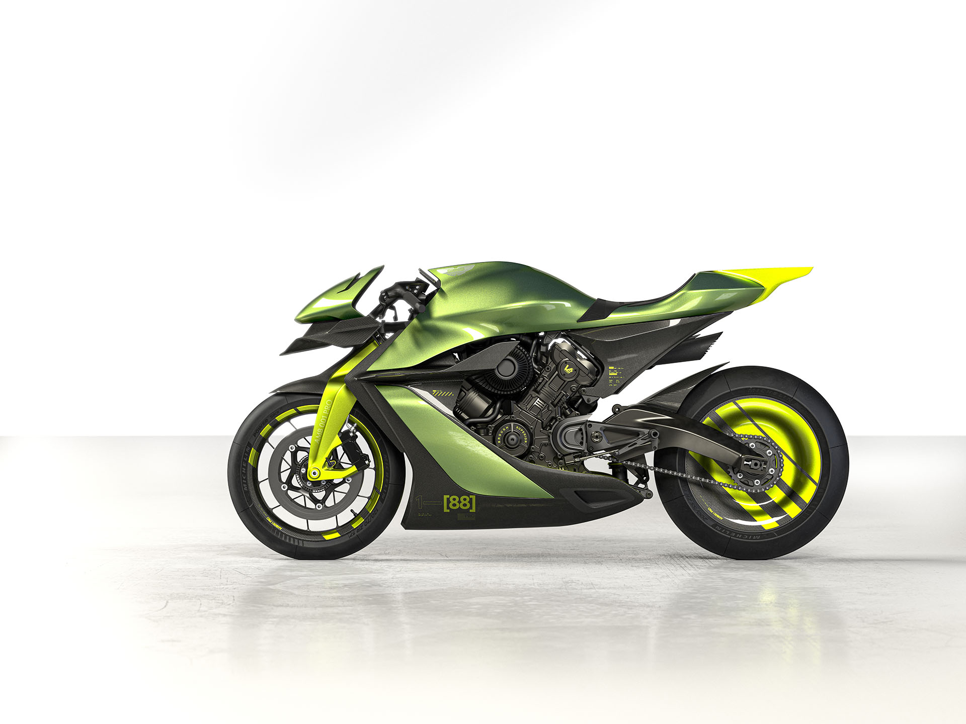 تعتمد دراجة أستون مارتن AMB 001 برو على محرك ثنائي الأسطوانات بسعة 1.0 لتر يولد قوة 225 حصان، ويتصل المحرك بناقل حركة رياضي من 6 سرعات، مع نظام تعشيق رياضي، وهيكل داخلي من الألمنيوم وألياف الكاربون للهيكل الخارجي للدراجة، ليصل وزن الدراجة الكلي 175 كجم.
