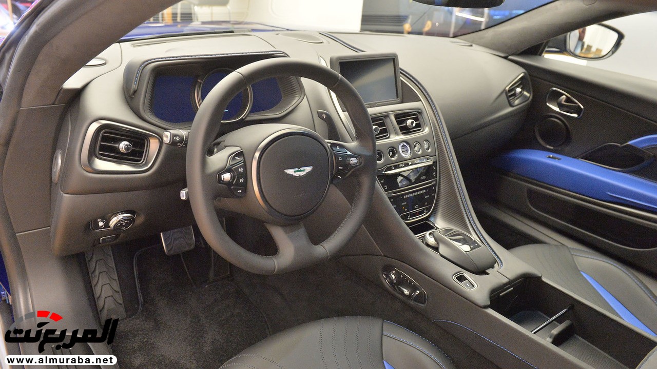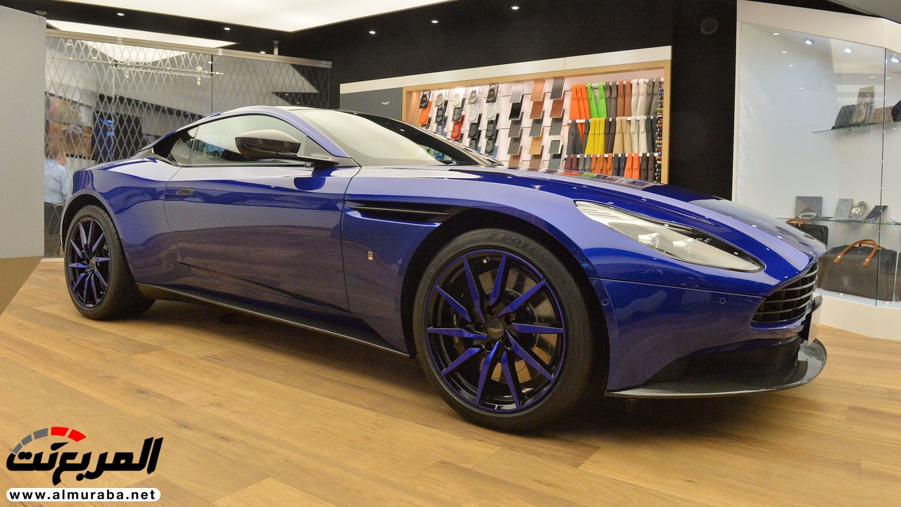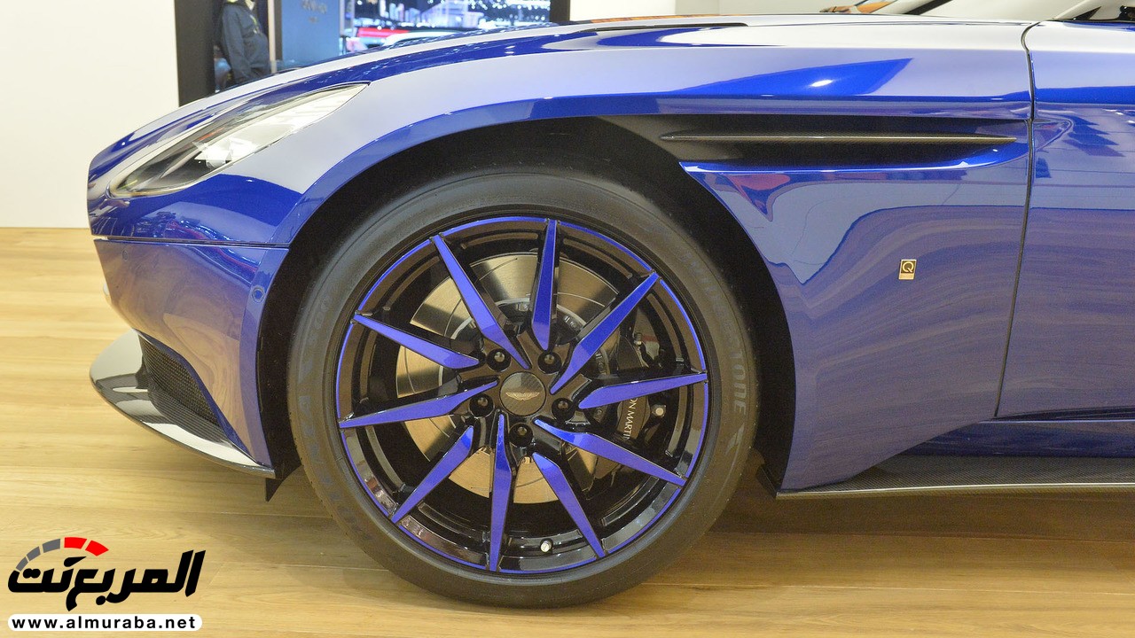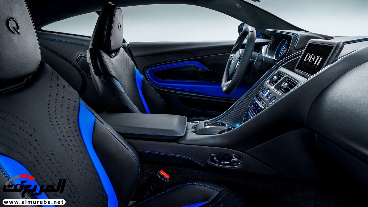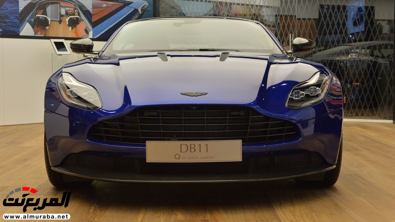والـ DB11 الجديدة هي نتاج عمل قسم Q التخصيصي بأستون مارتن, وكما ترون فالخارجية مطلاة بالأزرق اللامع والذي يكسي ألواح الأبواب والمقابض الداخلية والمقاعد والمفاتيح والعجلات, كما أنّ هنالك أليافًا كربونية مُصاغة بالجسم تتضمن المقدمة والعتبات الجانبية وحتى مرايا الأبواب, إلى جانب أنّ شارة Q موسومة على داخل وخارج السيارة.