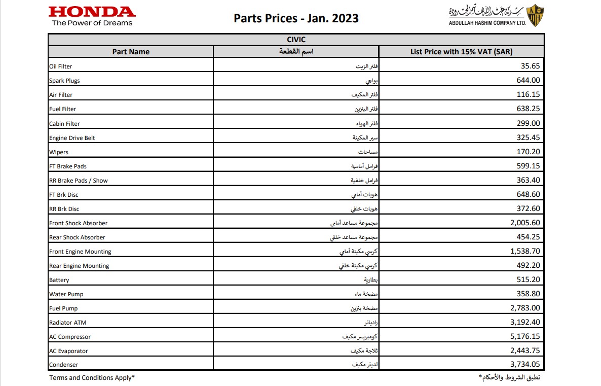 وتأتي أسعار قطع غيار هوندا سيفيك في السعودية بشكل مختلف من موديل إلى آخر، حيث لا يوجد سعر مُحدد بشكل دائم لقطع غيار هوندا سيفيك، إلا أن وكالة هوندا شركة عبدالله هاشم المحدودة توفر خدماتها تسهيلا على عملاء هوندا، والتي تُمكن الجميع من معرفة أسعار قطع غيار هوندا سيفيك.