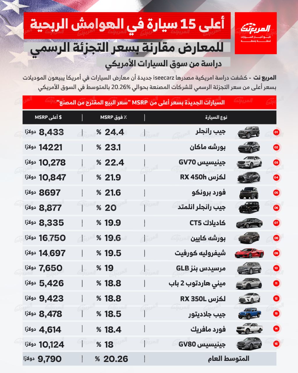 بإمكانكم الاطلاع على القائمة الكاملة لأعلى 15 موديل في الهوامش الربحية للمعارض الأمريكية مقارنة بسعر التجزئة الرسمي، وكما ترون، معظم السيارات في الجدول المرفق هي إما موديلات SUV أو موديلات فاخرة مثل كاديلاك CT5.
