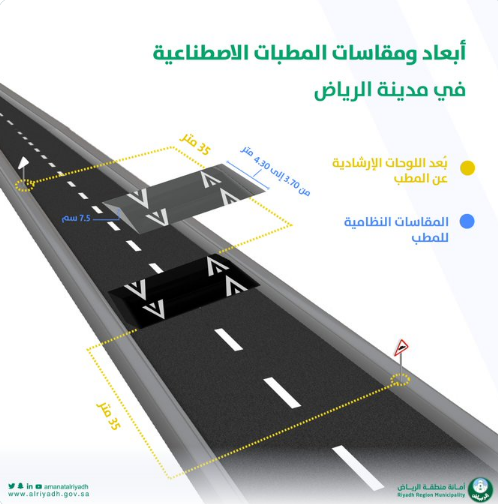 وأعلنت أمانة الرياض عن الضوابط والمقاييس الفنية والأبعاد الثابتة الخاصة بإنشاء المطبات الاصطناعية في شوارع الرياض، وقد تضمنت وضع لوحات إرشادية على مسافة 35 مترًا من المطبات الاصطناعية لتنبيه قائدي السيارات، كما حددت ارتفاع المطب 7.5 سم، ويتراوح عرضه ما بين 3.70 و4.30 من الأمتار.