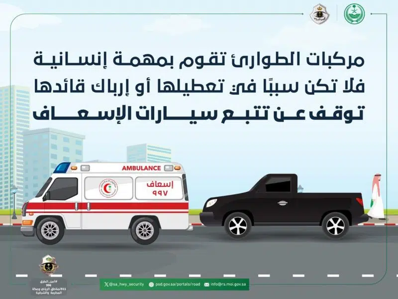 وأكدت أمن الطرق من خلال إنفوجراف نشرته عبر منصة إكس، على الأهمية البالغة لإفساح الطريق أمام مركبات الطوارئ وعدم تتبعهم لإنقاذ حياة الآخرين، حيث قالت: “مركبات الطوارئ تقوم بمهمة إنسانية، فلا تكن سببًا في تعطيلها أو إرباك قائدها”، و”توقف عن تتبع سيارات الإسعاف”.
