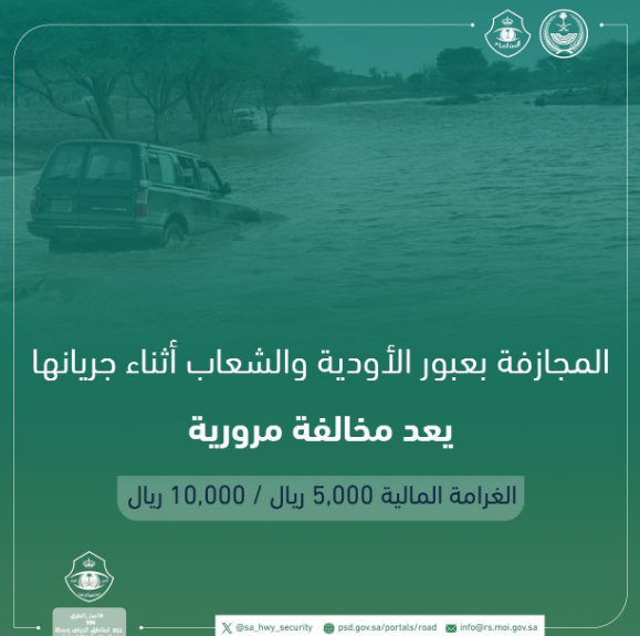 وفي سياق آخر، حذرت قوات أمن الطرق من خلال إنفوجراف نشرته عبر منصة إكس، قائدي المركبات من عبور الأودية والشعاب أثناء جريانها، مشددةً أنه تصرف جسيم يعرض حياتهم للخطر، ويعد مخالفة مرورية، وتتراوح غرامتها المالية ما بين 5,000 ريال إلى 10,000 ريال.